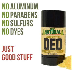 QUAL É O SEU HUMOR? ENCONTRE-O EM NOSSOS AROMAS Até Sam fica totalmente natural e cru. O DESODORANTE SEM PERFUME Sams deixa o aroma de nossos ingredientes totalmente naturais brilhar, deixando-o fresco por muito tempo depois do pôr do sol. Sams mantendo a realidade! INGREDIENTES NATURAIS ALTAMENTE EFICAZES: O desodorante natural sem perfume Sams é livre de alumínio, sem parabenos, sem toxinas, sem produtos químicos e sem propilenoglicol. INSTRUÇÕES: 1-2 toques são tudo o que você precisa e seu desodorante em bastão de 3 onças durará e terá um ótimo retorno sobre o investimento. PROCESSO DE DESINTOXICAÇÃO: O que saber sobre o processo de desintoxicação Ao fazer a transição de produtos à base de alumínio para um desodorante totalmente natural, algumas pessoas têm um aumento no odor corporal logo no início, que geralmente dura apenas alguns dias. Reserve pelo menos uma semana para se ajustar. Nossos desodorantes naturais são eficazes e você ficará feliz com sua escolha de trocar. – DESODORANTE NATURAL DISPONÍVEL EM 17 AROMAS INCRÍVEIS Oferecemos uma variedade de aromas distintos e intrigantes para cada personalidade ou ocasião. O DESODORANTE SEM PERFUME tem um aroma cru muito natural com um leve aroma de melaleuca. – DURADOURO E TRABALHOSO. Não confie sua higiene pessoal a qualquer pessoa. Fabricamos o desodorante natural Sams desde 2011 no sopé das Montanhas Brancas de New Hampshire. As pessoas ADORAM nossos desodorantes porque eles funcionam naturalmente para deixar você com um cheiro fresco o dia todo! – COMO SE INSCREVER Um pouco ajuda muito! Certifique-se de lavar e secar bem as axilas, garantindo a limpeza de qualquer acúmulo ou odor que tenha ocorrido. Em seguida, aplique apenas 1-2 toques leves. Resista à tentação de aplicar demais! A aplicação excessiva é um erro comum que pode causar uma pequena erupção cutânea. Se isso ocorrer, recomendamos reduzir a quantidade de aplicativos ou interromper o uso. Uma pequena porcentagem de pessoas pode simplesmente ser sensível aos ingredientes de nosso produto e não conseguir usar qualquer quantidade. – SEM PRODUTOS QUÍMICOS E ECOLÓGICA Nossa fórmula exclusiva é incrivelmente eficaz contra odores, sem o uso de produtos químicos agressivos. Nossos desodorantes naturais são livres de alumínio, parabenos, ftalatos e propilenoglicol. Também temos orgulho de sermos certificados como veganos e livres de crueldade! E como queremos ser tão gentis com a terra quanto com as axilas, nosso desodorante é embalado em tubos de plástico 100% recicláveis.