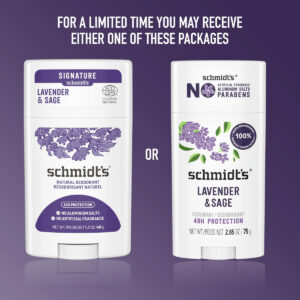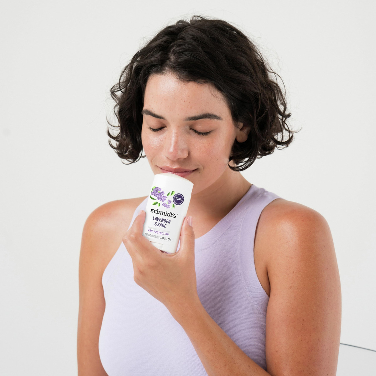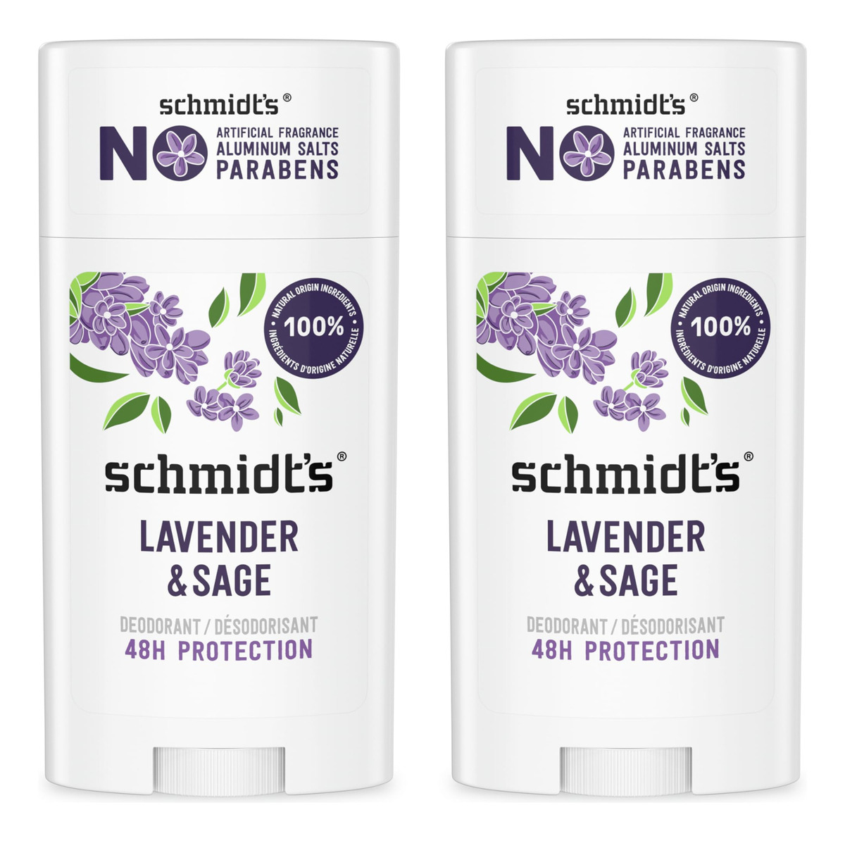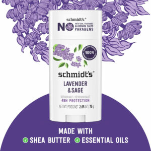 Desodorante vegano sem alumínio Schmidt's de lavanda e sálvia com proteção contra odores 24 horas, 2 unidades para mulheres e homens, ingredientes naturais, sem crueldade, 2,65 onças — Really Works Schmidt's Lavender & Sage é uma fragrância calmante para mulheres e homens que ajuda a neutralizar o odor e mantém você fresca com proteção contra odores de 24 horas. – Ingredientes certificados de origem 100% natural feitos com óleos essenciais, características de lavanda e sálvia um perfume floral, herbáceo e calmante. – Proteção comprovada Ao comprar um desodorante vegano para homens e mulheres, confira as 20.000 avaliações 5 estrelas de nosso desodorantes premiados. Há um perfume para todos. – Combate o odor corporal Obtenha proteção desodorante vegana durante todo o dia com apenas 12 toques. Mantenha o desodorante grudado brevemente na pele para amaciá-lo em contato com o calor corporal. – Ingredientes à base de plantas O desodorante Schmidts sem alumínio foi formulado para ser suave para a pele, usando ingredientes certificados de origem 100% natural, como magnésio e óleos essenciais que combatem odores.