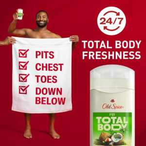 Desodorante de corpo inteiro Old Spice para homens, desodorante corporal total, aroma de Fiji, desodorante sem alumínio para frescor 24 horas por dia, 7 dias por semana//Desodorante de corpo inteiro testado por dermatologistas, 3,0 onças — USE EM TODO O CORPO Este é um desodorante corporal completo, suave o suficiente para qualquer lugar. Você pode experimentá-lo nas axilas, partes íntimas, peito, pernas, estômago, virilha, pescoço, pés, braços, mãos… – FRESCOR 24 HORAS POR DIA, 7 DIAS POR SEMANA – este desodorante corporal total com fragrância refrescante de baunilha e karité fará você cheirar bem, manterá você fresca e seca o dia todo. (Estudo interno da P&G, agosto e setembro de 2023) – TESTADO POR DERMATOLOGISTAS – Garantimos que nosso Total Body Deo fosse seguro para uso em qualquer lugar. Com zero de alumínio, parabenos, ftalatos e corantes, este produto foi feito para ser suave para a pele e é seguro de usar das covas aos pés e abaixo. (Estudo interno da P&G, agosto e setembro de 2023) – SOMENTE INGREDIENTES ESSENCIAIS – Cheirar bem é legal. Saber que o palito que você está usando para cheirar bem é feito com menos de 10 ingredientes é mais legal. Somente ingredientes essenciais para a melhor experiência corporal. – SMOOTH GLIDE – Existe algo melhor do que um stick Smooth Glide com um aroma incrível? Desodorante corporal total da Old Spice projetado exclusivamente para todo o seu corpo