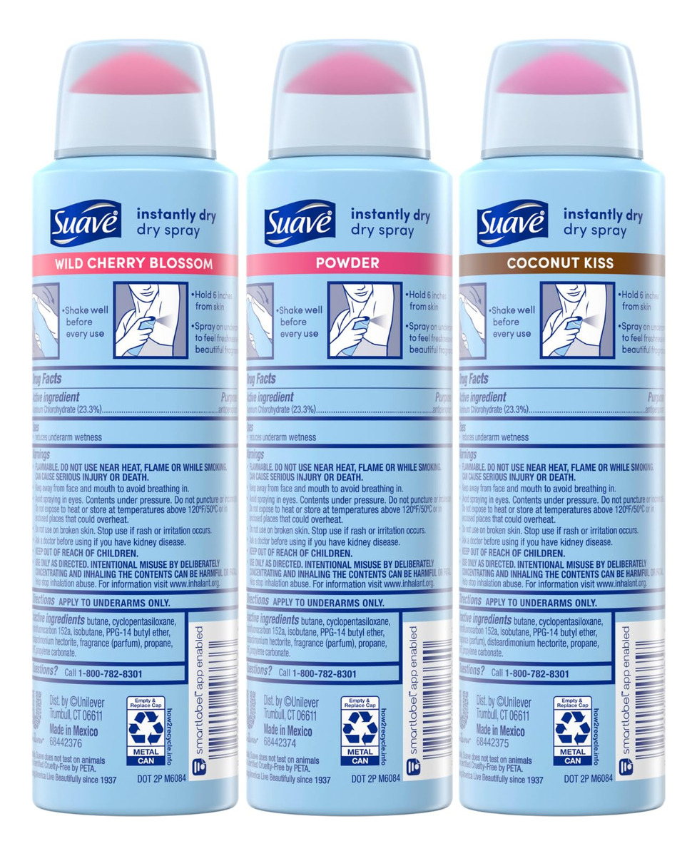 Comece o dia se sentindo confiante e revigorado! Um antitranspirante Suave Dry Spray oferece 48 horas de proteção contra odores e suor, ao mesmo tempo em que mantém a pele luxuosamente perfumada. Na Suave, ajudamos a América a viver lindamente desde 1937, oferecendo às famílias em todo o mundo produtos de higiene pessoal seguros e de alta qualidade para o dia a dia, projetados para trazer alegria a cada uso. É por isso que você ainda pode nos encontrar em 1 em cada 2 famílias dos EUA (e contando)! Nossa missão é tornar a qualidade padrão-ouro acessível a todos, para que todos possam ter uma aparência, cheirar e se sentir bem diariamente. Acreditamos que todos merecem acesso a uma beleza que desperte felicidade na mente, no corpo e no espírito. – SPRAYS DESODORANTES ANTITRANSPIRANTES: compre um pacote de antitranspirantes Suave Dry Spray em três aromas deliciosos. – DESODORANTE DURADOURO: após a aplicação, um antitranspirante perfumado Suave Dry Spray reduz a umidade e os odores das axilas por até 48 horas. – CONTINUA CLARO: Você Vai adorar como cada spray antitranspirante Suave seca instantaneamente e nunca deixa marcas em suas roupas. – INSTRUÇÕES: Agite o frasco de spray em aerossol antes de usar e aplique somente nas axilas. Para proteção extra contra bactérias que podem causar odor nas axilas, adicione um sabonete líquido suave à sua rotina de banho. – SUAVE É LIVRE DE CRUELDADE: globalmente, o Suave não faz testes em animais e é certificado como livre de crueldade pela PETA.