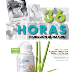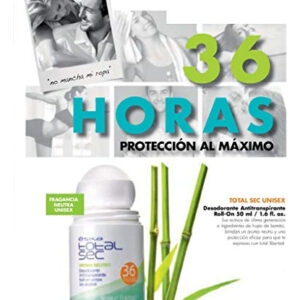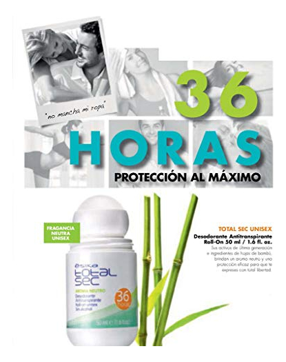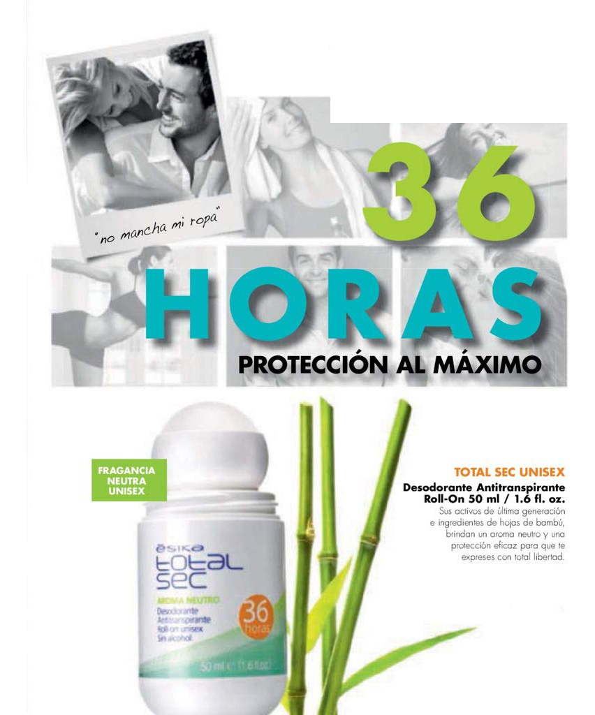 Esika Total Sec 36 te protegen del mal olor y te mantiene tu piel fresca por todo el da. Te protege de la sudoracin y del mal olor y te brinda un exquisito aroma que permanece todo el da. Su frmula contiene extracto de hojas de bamb que protege la piel de irritaciones y resequedad. Adems, no contiene alcohol.