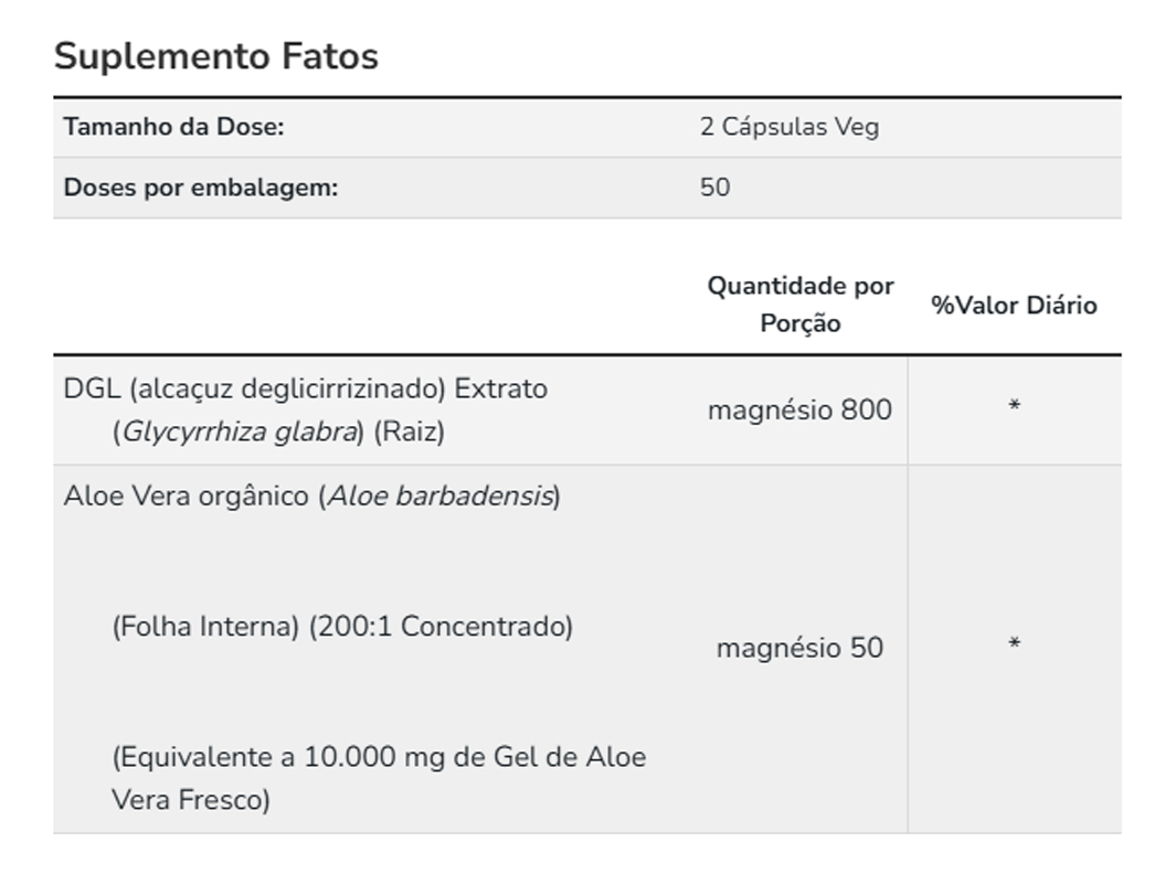 Cada cápsula contém 400mg de DGL combinados com Aloe Vera, oferecendo uma formulação cuidadosamente elaborada para atender às suas necessidades. A composição do produto é projetada para fornecer um suplemento confiável e eficaz, apoiando seu bem-estar diário. Validade longa
