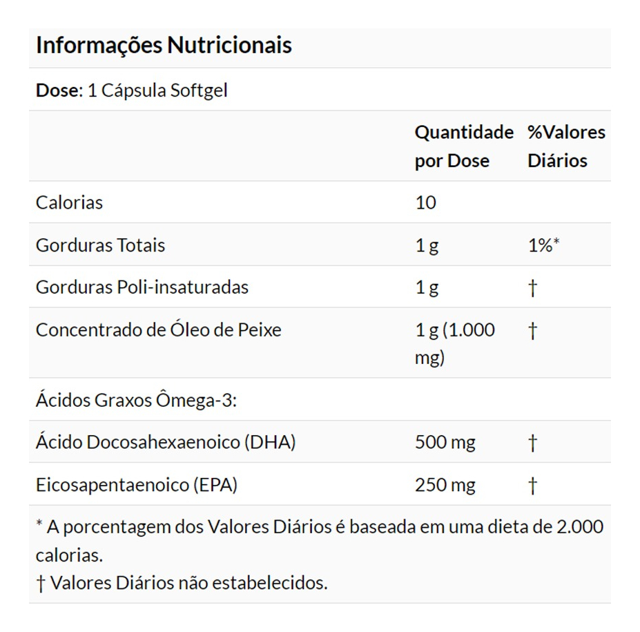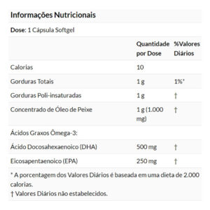 1 g concentrado de aceite de pescado, 1 g grasa poli-insaturada, 1 g grasa total, 250 mg ácido eicosapentaenoico (EPA), 500 mg ácido docosahexaenoico (DHA) |