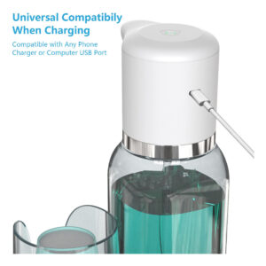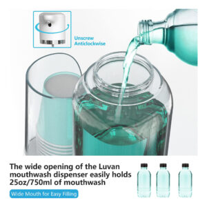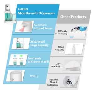 Ajude a prevenir a cárie dentária, fortalecer os dentes e melhorar sua saúde bucal com a máquina elétrica de enxaguatório bucal luvan. O recipiente de 25 onças/750 ml pode armazenar uma grande quantidade de líquido para enxaguatório bucal, o que é mais econômico. O diâmetro grande é adequado para enchimento sem enchimento frequente, o que é mais conveniente e economiza mão de obra. A bomba de enxaguatório bucal com motor elétrico de alta velocidade funciona perfeitamente. Você só precisa tocar no botão, colocar o copo de papel na área de detecção de infravermelho e a saída da máquina de enxaguatório bucal distribuirá rapidamente um enxaguante bucal preciso para você. Ideal para adultos e crianças que precisam proteger sua saúde bucal. * Sensor infravermelho de alta precisão * 0,24 s de líquido sai rapidamente * Dois níveis de volume de líquido * Capacidade da bateria de 1400 mAh * Adequado para vários líquidos – Bomba automática de enxaguatório bucal atualizada – O dispensador automático de enxaguante bucal Luvan para banheiro possui motor embutido de alta velocidade e sensor infravermelho preciso. Quando você coloca o copo de papel sob o sensor e toca no pequeno botão de gota de água, a bomba elétrica de enxaguatório bucal atualizada detecta e dispensa com precisão a quantidade de líquido desejada, minimizando entupimentos, resíduos, derramamentos e vazamentos, permitindo que seu gargarejo seja mais higiênico e relaxado. – Volume de líquido ajustável em dois níveis – O dispensador de enxaguante bucal de grande capacidade com porta-copos pode armazenar 25 onças/750 ml de enxaguante bucal, com uma ampla abertura para facilitar o enchimento e sem necessidade de recargas frequentes. O recipiente automático para enxaguatório bucal está disponível em dois níveis diferentes, 20 ml ou 30 ml, dependendo das diferentes necessidades de adultos e crianças que usam enxaguatório bucal para evitar desperdício. O frasco de enxaguante bucal para banheiro é compatível com a maioria dos tipos de líquidos, como xampu, creme de banho e sabonete. – Design recarregável – Bateria embutida de 1400mAh, recarregável via USB (Tipo C), o tempo de carregamento é de apenas 2 horas, pode funcionar cerca de 2000 vezes com uma única carga e pode ser usado por mais de 90 dias após a carga completa. Comparado com o dispensador de enxaguante bucal com bateria própria, ele reduz o consumo e a substituição de baterias, reduz o impacto do desperdício de baterias no meio ambiente e é mais econômico e durável. – Plástico premium sem BPA – Este dispensador de bomba de enxaguatório bucal moderno para banheiro é feito de plástico sem BPA, que é seguro, inodoro e durável. A garrafa e a base são separadas para que você possa pegá-la, colocá-la, enchê-la e carregá-la com facilidade. O design simples e elegante do recipiente para lavagem bucal torna a bancada do banheiro mais organizada, sem que frascos volumosos de enxaguante bucal originais ocupem muito espaço. – Dispensador de copos de papel em forma de U – O dispensador de enxaguante bucal infantil azul transparente com 8 copos de papel descartáveis. A abertura em forma de U e o design superior aberto do dispensador de copos facilitam o transporte de copos e ajudam a manter sua pia ou bancada organizada. O fundo do recipiente é equipado com quatro pés de borracha antiderrapantes para garantir que o porta-enxaguante bucal não se mova sobre a bancada, protegendo sua bancada e ajudando você a limpar a boca com mais conforto e facilidade.