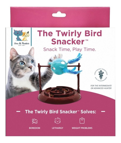 Dispensador de comida e guloseimas em forma de pássaro. Dispensador de carregamento superior com tampa de encaixe. O pássaro gira enquanto o gato dá as patas nele, distribuindo comida na bandeja abaixo. As penas são removíveis para limpeza.