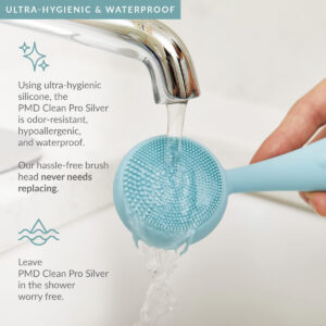 PMD Beauty Clean Pro Silver – Dispositivo inteligente de limpeza facial com escova de silicone e massageador antienvelhecimento Pure Silver ActiveWarmth – Impermeável – SonicGlow Vibration – Limpe poros e cravos – Tecnologia SonicGlow – Com 7.000 vibrações por minuto, o Clean remove profundamente as impurezas da pele ao remover a sujeira e o óleo de dentro dos poros – A beleza do silicone – Usando silicone ultra-higiênico, o PMD Clean é resistente a odores, hipoalergênico e impermeável. Nossa cabeça de escova fácil nunca precisa ser substituída. – Personalizável para todos os tipos de pele – Um poderoso dispositivo de limpeza com cerdas suaves o suficiente para todos os tipos de pele. Com quatro modos personalizáveis, o PMD Clean oferece uma gama completa de opções de limpeza – Massagem facial ActiveWarmth – A tecnologia ActiveWarmth apresentada no PMD Clean Pro usa terapia térmica combinada com SonicGlow para ativar seus cuidados com a pele, auxiliando em uma absorção e eficácia mais profundas – Prata pura – Banhado com prata pura, o massageador de metais preciosos oferece benefícios antienvelhecimento