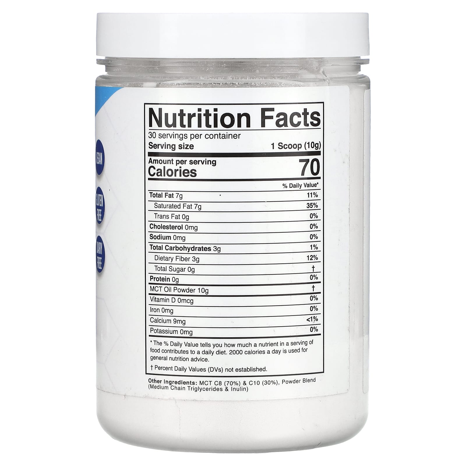 TCM C8 (70%) e C10 (30%), mistura em pó (triglicerídeos de cadeia média, inulina).