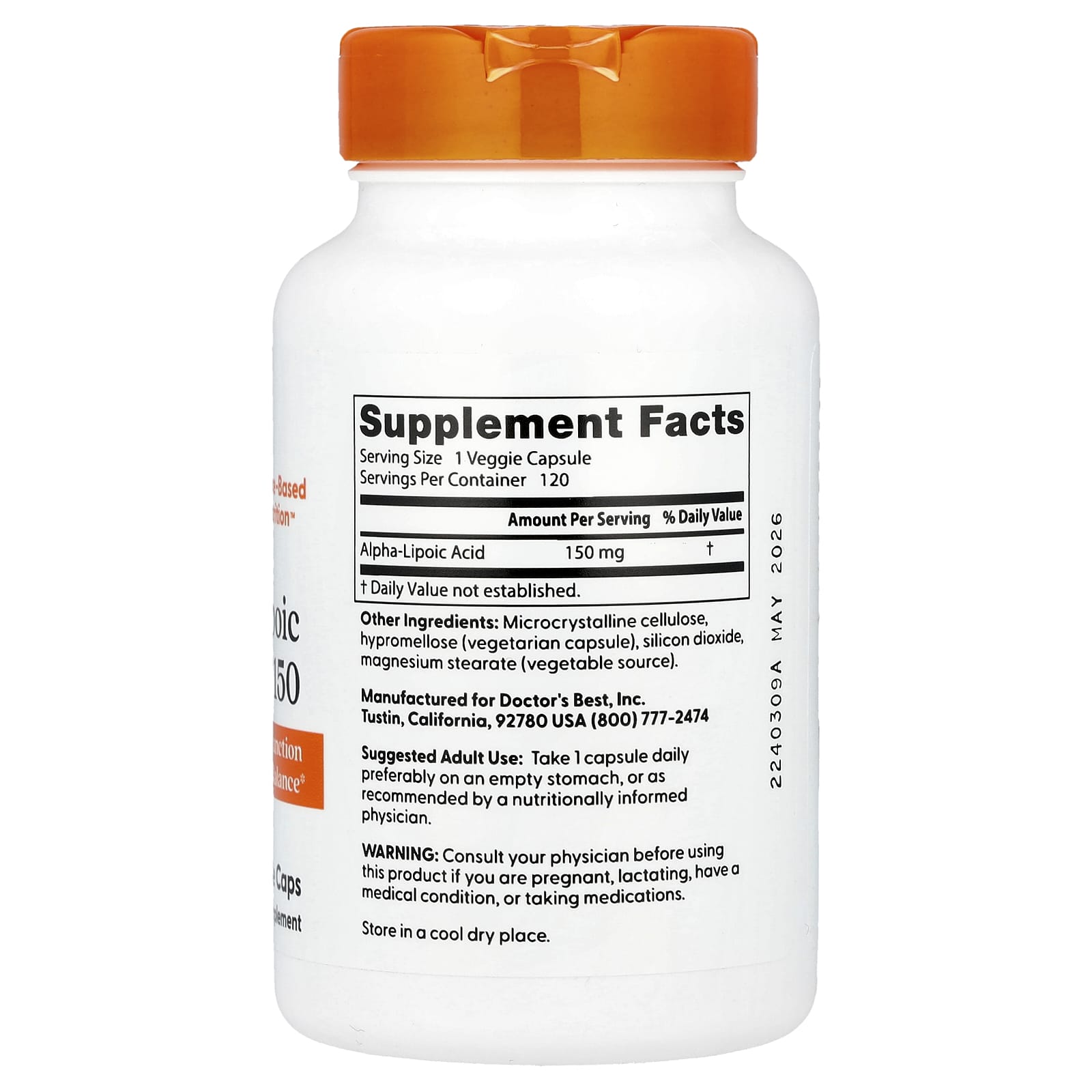 Doctors Best Ácido Tióctico 150 150 mg 120 Cápsulas Vegetais – Doctor’s Best Suplementos Antioxidantes Ácido alfa lipoico.