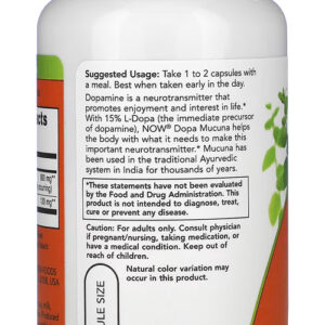 Dopa Mucuna Now Foods 90 Cápsulas Vegetarianas / No Brasil   Apresentando uma mistura de 800mg de Macuna com 120mg de L-dopa, o precursor imediato da dopamina, a Dopa Mucuna da Now Foods, disponível em cápsulas vegetarianas que podem ser facilmente dissolvidas, ajuda o corpo com o que ele precisa para produzir esta importante substância e corresponde à forma eficiente de complementação de sua dieta alimentar.   Outros Ingredientes: Hipromelose (cápsula de celulose), Celulose Microcristalina e Ácido Esteárico (fonte vegetal).   Fabricado sem trigo, glúten, soja, leite, ovo, peixe, marisco ou nozes.   Recomendação de uso. Tome 1 a 2 cápsulas com uma refeição. Melhor quando tomado no início do dia.   Cuidados: Apenas para adultos. Busque orientação se estiver grávida ou amamentando. Mantenha fora do alcance de crianças.   Armazenar em local fresco e seco após a abertura. Pode ocorrer variação de cor natural neste produto.   Dimensões: 5,5 x 5,5 x 10,5 cm Peso:0,086   Itens inclusos: 1x Frasco com 90 Cápsula   Vide Validade