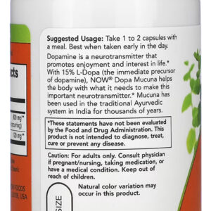 Dopa Mucuna Now Foods 90 Cápsulas Vegetarianas / No Brasil Apresentando uma mistura de 800mg de Macuna com 120mg de L-dopa, o precursor imediato da dopamina, a Dopa Mucuna da Now Foods, disponível em cápsulas vegetarianas que podem ser facilmente dissolvidas, ajuda o corpo com o que ele precisa para produzir esta importante substância e corresponde à forma eficiente de complementação de sua dieta alimentar. Outros Ingredientes: Hipromelose (cápsula de celulose), Celulose Microcristalina e Ácido Esteárico (fonte vegetal). Produzido sem trigo, glúten, soja, leite, ovo, peixe, marisco ou nozes. Recomendação de uso. Tome 1 a 2 cápsulas com uma refeição. Melhor quando tomado no início do dia. Cuidados: Apenas para adultos. Busque orientação se estiver grávida ou amamentando. Mantenha fora do alcance de crianças. Armazenar em local fresco e seco após a abertura. Pode ocorrer variação de cor natural neste produto. Dimensões: 5,5 x 5,5 x 10,5 cm Peso:0,086 Itens inclusos: 1x Frasco com 90 Cápsula Vide Validade '.