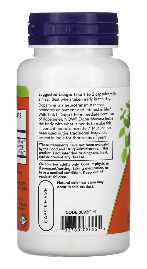 Dopa Mucuna Now Foods 90 Cápsulas Vegetarianas / No Brasil   Apresentando uma mistura de 800mg de Macuna com 120mg de L-dopa, o precursor imediato da dopamina, a Dopa Mucuna da Now Foods, disponível em cápsulas vegetarianas que podem ser facilmente dissolvidas, ajuda o corpo com o que ele precisa para produzir esta importante substância e corresponde à forma eficiente de complementação de sua dieta alimentar.   Outros Ingredientes: Hipromelose (cápsula de celulose), Celulose Microcristalina e Ácido Esteárico (fonte vegetal).   Fabricado sem trigo, glúten, soja, leite, ovo, peixe, marisco ou nozes.   Recomendação de uso. Tome 1 a 2 cápsulas com uma refeição. Melhor quando tomado no início do dia.   Cuidados: Apenas para adultos. Busque orientação se estiver grávida ou amamentando. Mantenha fora do alcance de crianças.   Armazenar em local fresco e seco após a abertura. Pode ocorrer variação de cor natural neste produto.   Dimensões: 5,5 x 5,5 x 10,5 cm Peso:0,086   Itens inclusos: 1x Frasco com 90 Cápsula   Vide Validade