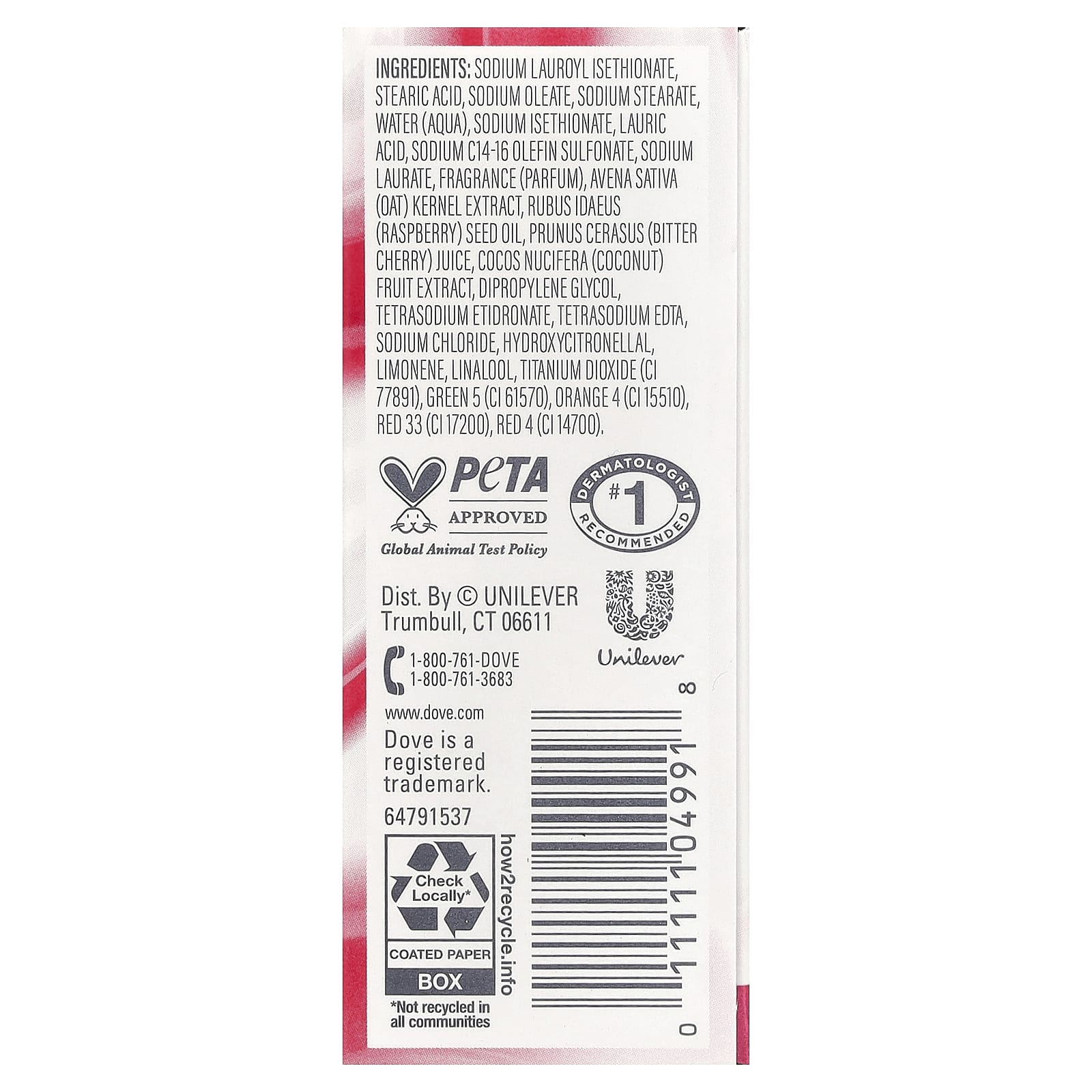 Sodium lauroyl isethionate, ácido esteárico, oleato de sódio, estearato de sódio, água (aqua), sodium isethionate, ácido láurico, sodium C14-16 olefin sulfonate, sodium laurate, fragrância (perfume), extrato de Avena sativa (aveia), óleo de semente de rubus idaeus (framboesa), suco de Prunus cerasus (cereja amarga), extrato da fruta de Cocos nucifera (coco), dimetildietilenoglicol, tetrasodium etidronate, EDTA tetrassódico, cloreto de sódio, hydroxycitronellal, limoneno, linalol, dióxido de titânio (CI 77891), verde 5 (CI 61570), orange 4 (CI 15510), vermelho 33 (CI 17200), vermelho 4 (CI 14700).