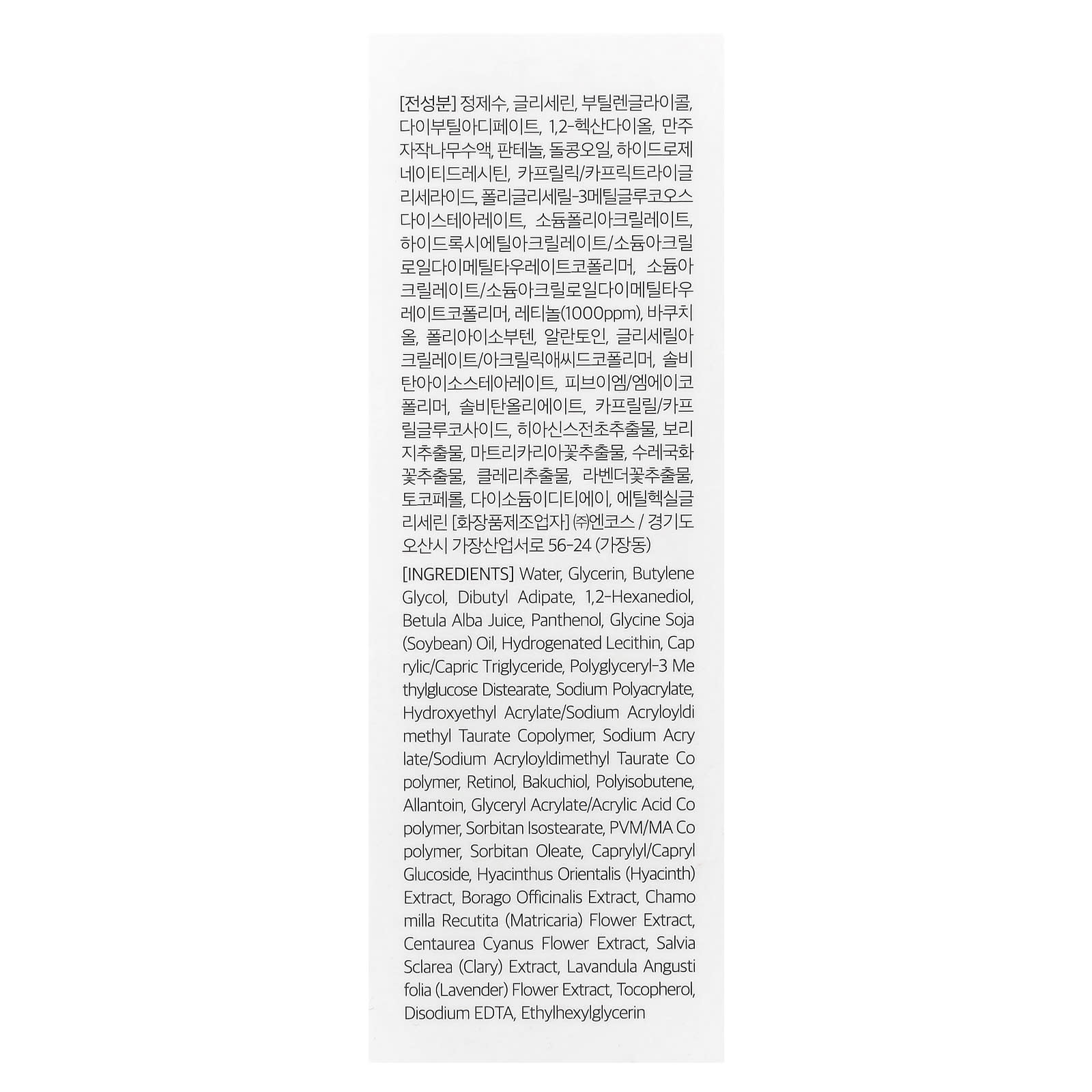 Água, glicerina, butilenoglicol, adipato de dibutila, 1,2-hexanediol, suco de Betula alba, pantenol, óleo de Glycine soja (soja), lecitina hidrogenada, caprylic/capric triglyceride, polyglyceryl-3 methylglucose distearate, sodium polyacrylate, copolímero de acriloildimetiltaurato de sódio e acrilato de hidroxietila, sodium acrylate/sodium acryloyldimethyl taurate copolymer, retinol, bakuchiol, poli-isobutileno, alantoína, glyceryl acrylate/acrylic acid copolymer, isoestearato de sorbitana, copolímero pvm/ma, oleato de sorbitana, caprylyl/capryl glucoside, extrato de Hyacinthus orientalis (jacinto), extrato de Borago officinalis, extrato da flor de Chamomilla recutita (matricária), extrato da flor do Centaurea cyanus, extrato de Salvia sclarea (sálvia), extrato da flor de Lavandula angusti folia (lavanda), tocoferol, edetato dissódico, ethylhexylglycerin.