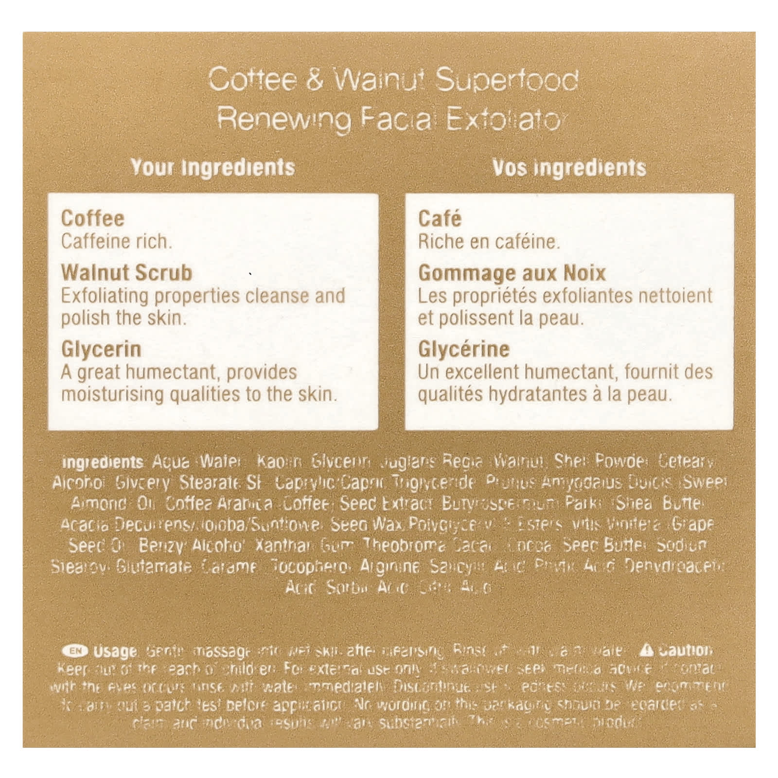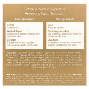 Aqua (água), caulim, glicerina, pó da casca de nozes Juglans regia, álcool cetoestearílico, monoestearato de glicerila autoemulsionável, caprylic/capric triglyceride, Prunus amygdalus dulcis (óleo de amêndoa doce), extrato da semente de Coffea arabica (café), manteiga de Butyrospermum parkii (karité), cera da semente de Acacia decurrens/jojoba/girassol, ésteres de poliglicerídeos, óleo da semente de Vitis vinifera (uva), álcool benzílico, goma xantana, manteiga da semente de Theobroma cacao (cacau), estearoil sódico, caramelo de glutamato, tocoferol, arginina ácido salicílico e ácido fítico, dehydroacetic acid, ácido sórbico, ácido cítrico.