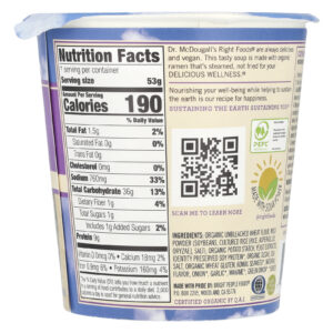 Dr. A McDougall’s Right Foods® é sempre deliciosa e vegana. Esta saborosa sopa é feita com ramen orgânico que é cozido no vapor, e não frito, para o seu Delicious Wellness.®