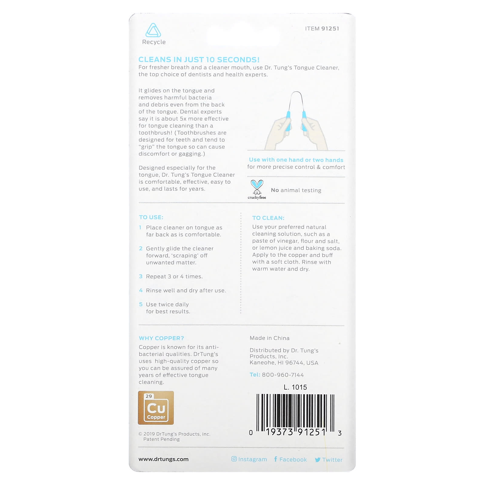 Projetado especialmente para a língua. Dr. O Limpador de Língua da Tung é confortável, eficaz, fácil de usar e dura anos.