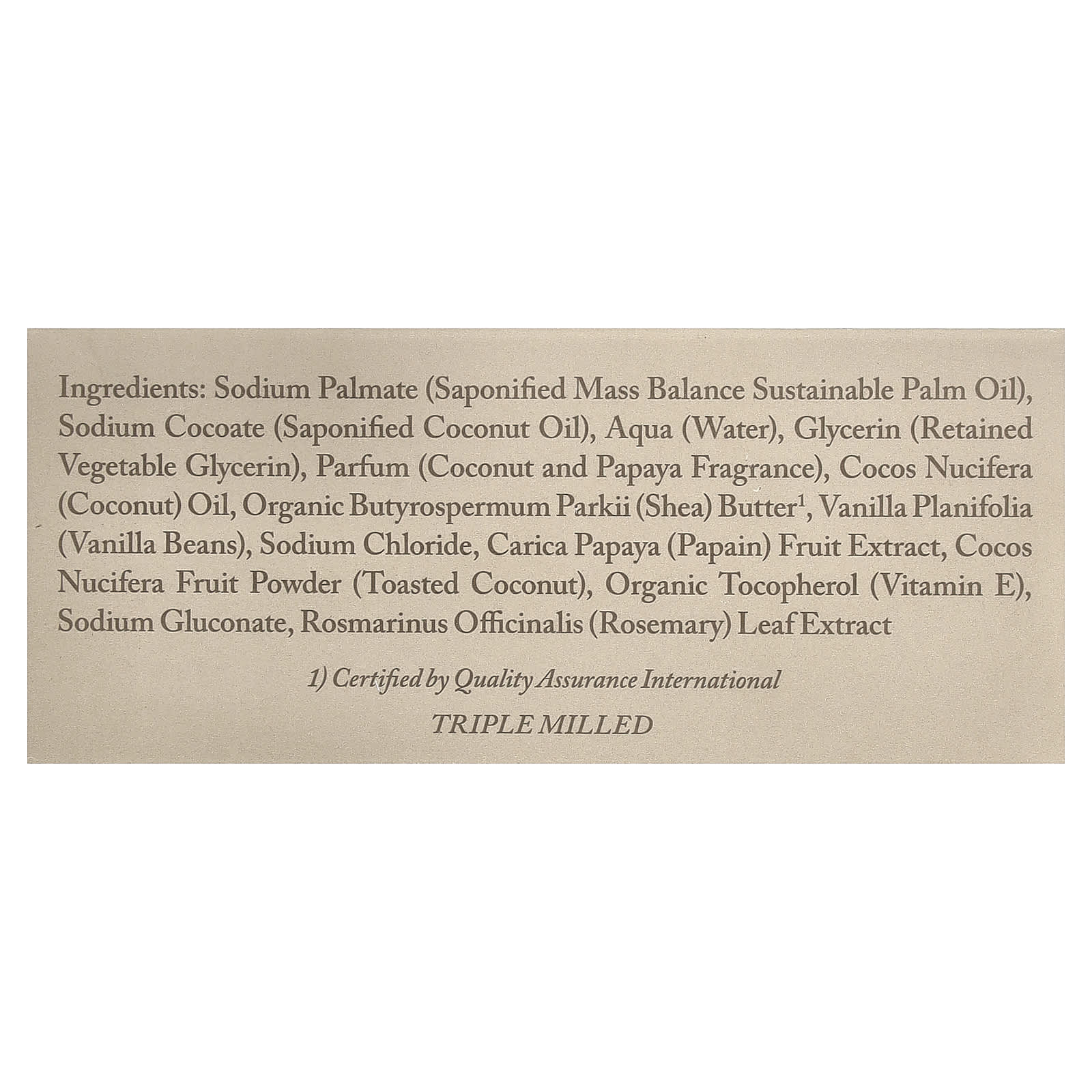 Palmate de sódio (óleo de palma sustentável e saponificado com balanço de massa), sodium cocoate (óleo de coco saponificado), aqua (água), glicerina (glicerina vegetal retida), perfume (fragrância de coco e mamão), óleo de Cocos nucifera (coco), manteiga de Butyrospermum parkii (karité) orgânica1, Vanilla planifolia (fava de baunilha), cloreto de sódio, extrato da fruta de Carica papaya (papaína), Pó da fruta Cocos nucifera (coco torrado), tocoferol orgânico (vitamina E), gliconato de sódio, extrato da folha de Rosmarinus officinalis (alecrim).