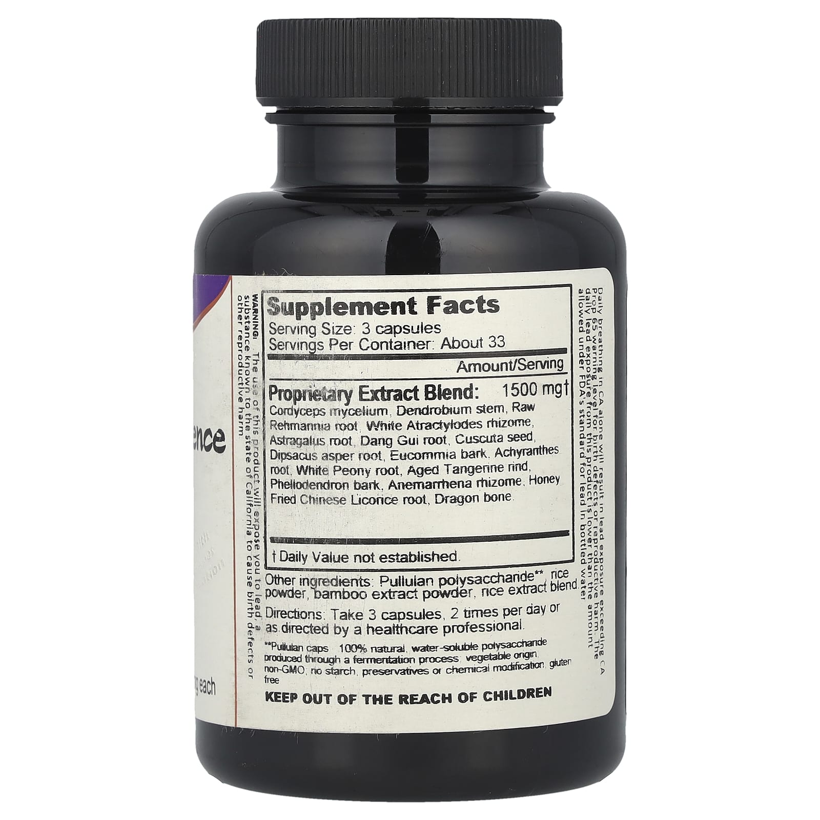 | Formula Extract Formula: Micelio de Cordyceps, Dendrobium, raiz Raw Rehmannia, rizoma de Atractylodes de Bai-zhu, raiz de Astragalus, raiz de Dong quai, semente de Cuscuta chinensis, raiz de Dipsacus asper, casca de Eucommia, raiz de Achyranthes, raiz de peônia branca chinesa, casca de tangerina envelhecida, casca de phellodendron, rizoma de anemarroma , Raiz de alcaçuz de mel com ração de mel, osso do dragão. |