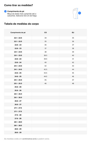Verifique o comprimento do pé e o tamanho do calçado local antes de comprar. O tamanho do nosso calçado é UE, o que é bastante diferente do tamanho do calçado local. Para evitar o risco de devoluções ou trocas, escolha o tamanho de calçado da UE que melhor se adapta a si com base no comprimento do pé e no tamanho de calçado local.