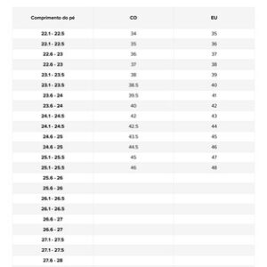 Verifique o comprimento do pé e o tamanho do calçado local antes de comprar. O tamanho do nosso calçado é UE, o que é bastante diferente do tamanho do calçado local. Para evitar o risco de devoluções ou trocas, escolha o tamanho de calçado da UE que melhor se adapta a si com base no comprimento do pé e no tamanho de calçado local.