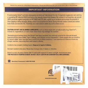 Se usados corretamente, os conservantes de poli-isopreno sintéticos da Durex® ajudam a reduzir o risco de gravidezes indesejadas e de contração ou transmissão da infecção pelo hiv [aids] e muitas outras doenças sexualmente transmissíveis. Nenhum método contraceptivo pode fornecer 100% de proteção contra gravidez, hiv [aids] e DSTs. O uso não vaginal de conservantes pode aumentar a possibilidade de eles escorregarem ou serem danificados. Consulte seu médico para obter orientação. Durante o contato íntimo, lesões e vários fluidos corporais podem transmitir DSTs. Portanto, use um novo conservante antes que ocorra esse contato.