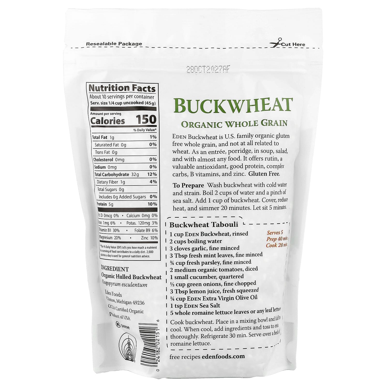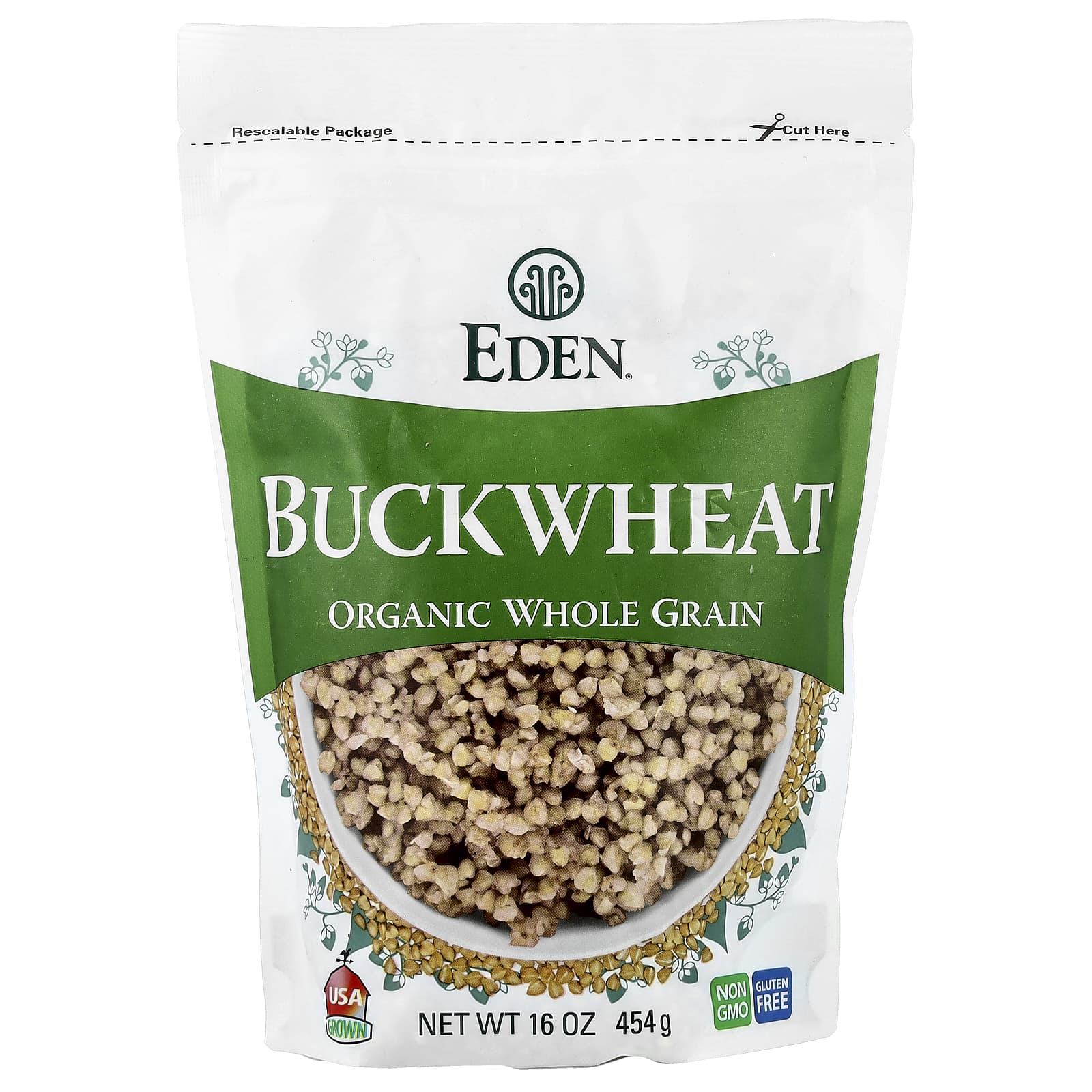 Eden Buckwheat é um grão integral sem glúten orgânico da família dos EUA e não é relacionado ao trigo. Como entrada, mingau, na sopa, salada e com quase todos os alimentos. Ele oferece rutina, um antioxidante valioso, proteína boa, carboidratos complexos, vitaminas B e zinco.