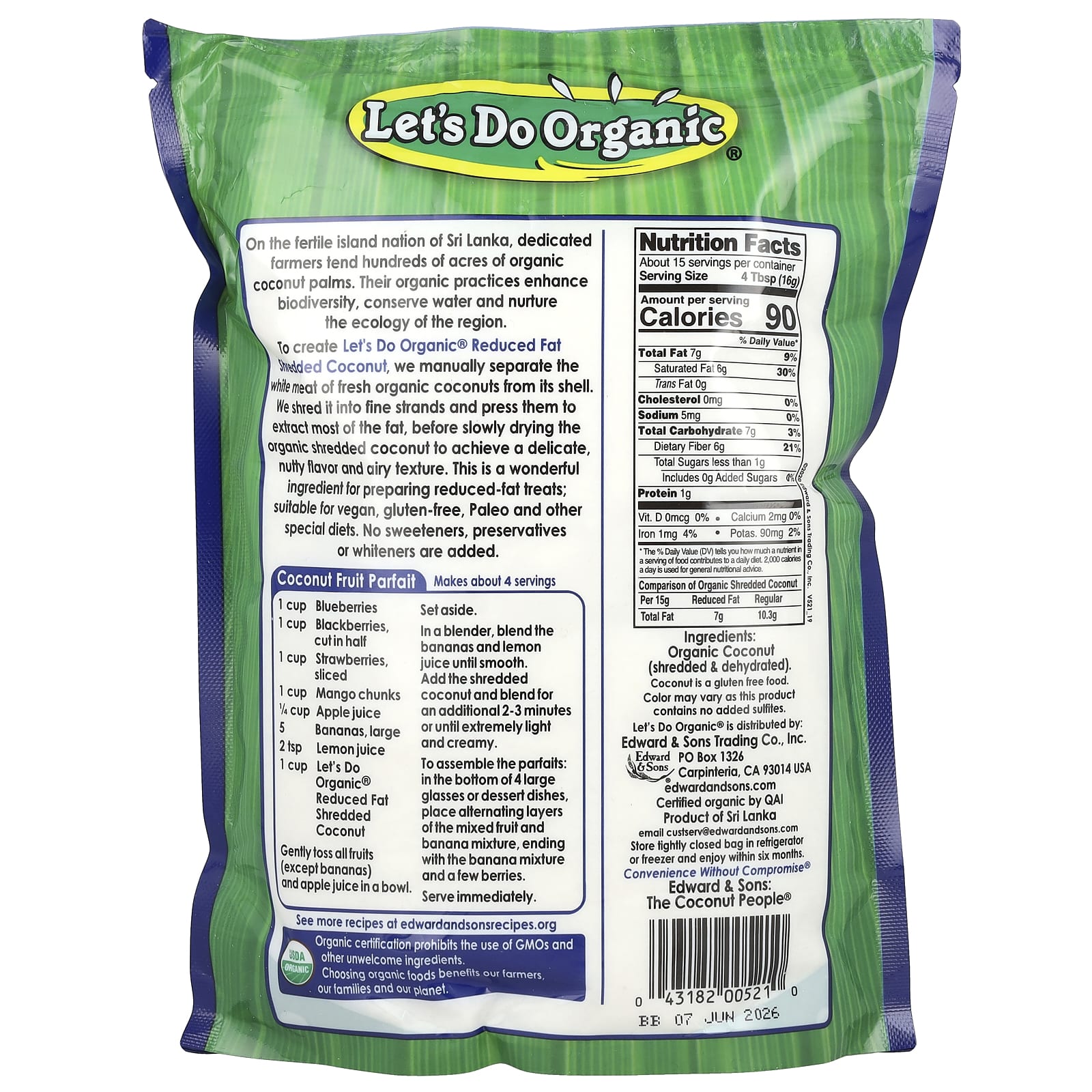 Para criar o Coco Ralado de Gordura Reduzida da Let’s Do Organic, nós separamos manualmente a carne branca de cocos orgânicos frescos de suas cascas. Nós os ralamos em finos flocos e os prensamos para extrair o máximo de gordura, antes de desidratarmos lentamente o coco ralado orgânico para atingir um sabor delicado, semelhante a castanha, e uma textura aerada. Ele é um ingrediente maravilhoso para preparar delícias com menos gordura; adequado para dietas veganas, sem glúten, páleo e outras dietas especiai. Sem adição de adoçantes, conservantes ou clareadores.