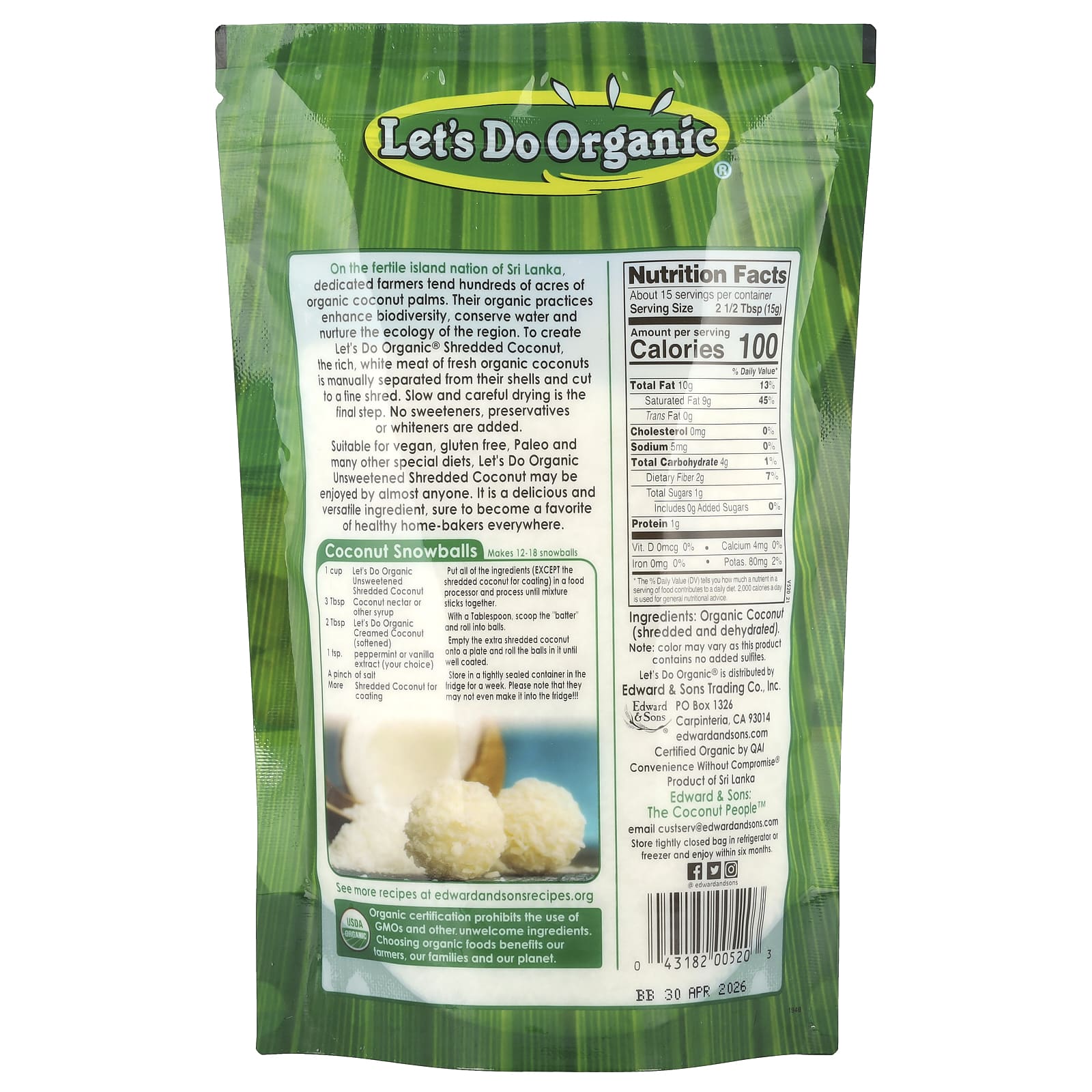 Na fértil país insular do Sri Lanka, agricultores dedicados cultivam centenas de acres de coqueiros orgânicos. Suas práticas orgânicas aumentam a biodiversidade, conservam água e nutrem a ecologia da região. Para produzir o Coco Rejuvenescido da Let’s Do Organic®, a carne branca e nutritiva dos cocos orgânicos frescos é separada manualmente de suas cascas e cortada em pedaços finos. A secagem lenta e cuidadosa é a etapa final. Não são adicionados adoçantes, conservantes ou branqueadores.