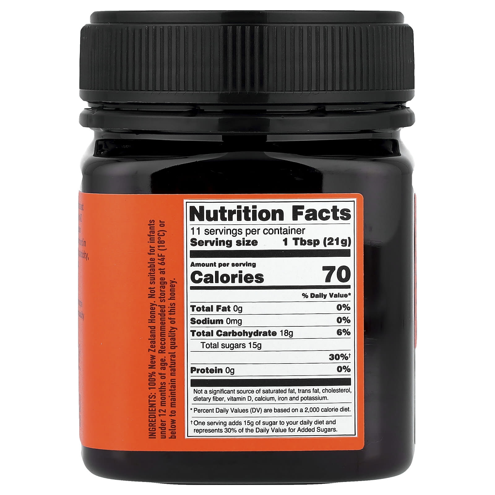 Não adequado para crianças com menos de 12 meses de idade. É recomendável o armazenamento a 18 °C (64 °F) ou menos para manter a qualidade natural deste mel.