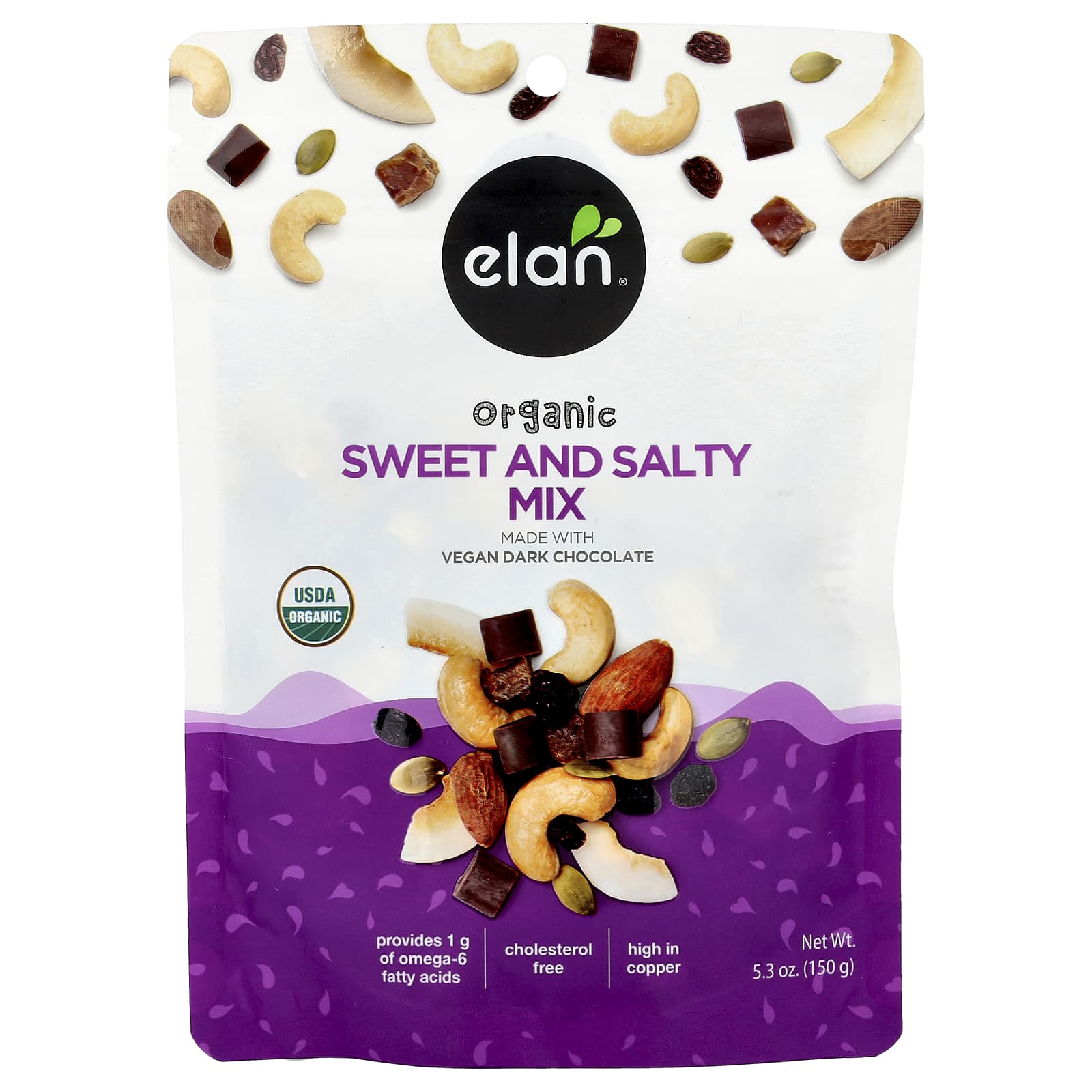 A Mistura Doce e Salgada da Elan é uma mistura rica de chocolate amargo, tâmaras orgânicas, passas, lascas de coco, sementes de abóbora, com castanhas de caju e amêndoas que foram levemente torradas e salgadas com perfeição. Chocolate e frutas são uma combinação harmoniosa feita nos céus. Esta combinação exclusiva de nozes orgânicas, frutas e chocolate satisfazerá o lanche mais exigente. E que lanche melhor para levar em uma longa caminhada ou caminhada? Repleta de nozes, frutas, sementes e chocolate, esta mistura é facilmente transportada e estimulará sua diversão ao ar livre.