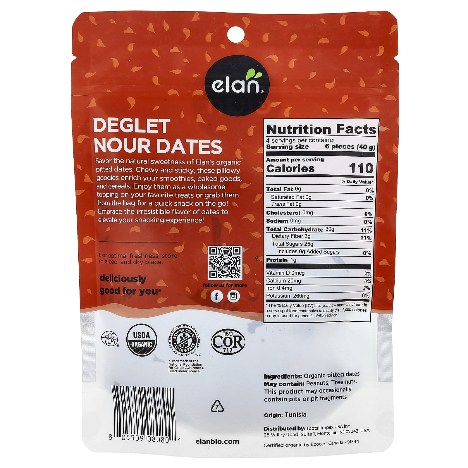 Saboreie a doçura natural das tâmaras orgânicas sem caroço da Elan. Mastigáveis e pegajosas, essas guloseimas enriquecem seus smoothies, assados e cereais. Aprecie-os como uma cobertura saudável para suas guloseimas favoritas ou pegue-os da embalagem para um lanche rápido em qualquer lugar! Abrace o sabor irresistível das tâmaras para aprimorar sua experiência de lanche!