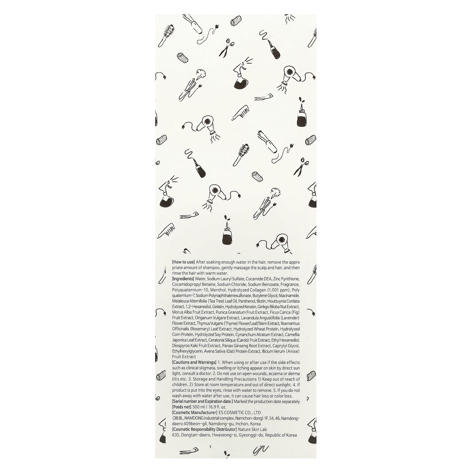 Água, laurilsulfato de sódio, dietanolamina cocamida, piritiona zíncica, cocoamidopropilbetaína, cloreto de sódio, benzoato de sódio, fragrância, poliquatérnio-10, mentol, colágeno hidrolisado (1.001 ppm), poli quatérnio-7, polinaftalenosulfonato de sódio, butilenoglicol, nicotinamida, óleo da folha de Melaleuca alternifolia (melaleuca), pantenol, biotina, extrato de Houttuynia cordata, 1,2-hexanediol, gelatina, queratina hidrolisada, extrato de Ginkgo biloba, extrato da fruta de Morus alba, extrato da fruta de Punica granatum, extrato da fruta de Ficus carica (figo), extrato de Origanum vulgare, extrato da flor de Lavandula angustifolia (lavanda), extrato da flor/folha/caule de Thymus vulgaris (tomilho), extrato da folha de Rosmarinus officinalis (alecrim), proteína de trigo hidrolisada, proteína de milho hidrolisada, proteína de soja hidrolisada, extrato de Cynanchum atratum, extrato da folha de Camellia japonica, extrato da fruta de Ceratonia siliqua (alfarroba), ethyl hexanediol, extrato da fruta de Diospyros kaki, extrato da raiz de Panax ginseng, caprylyl glycol, ethylhexylglycerin, extrato proteico de Avena sativa (aveia), extrato da fruta de Illicium verum (anis).
