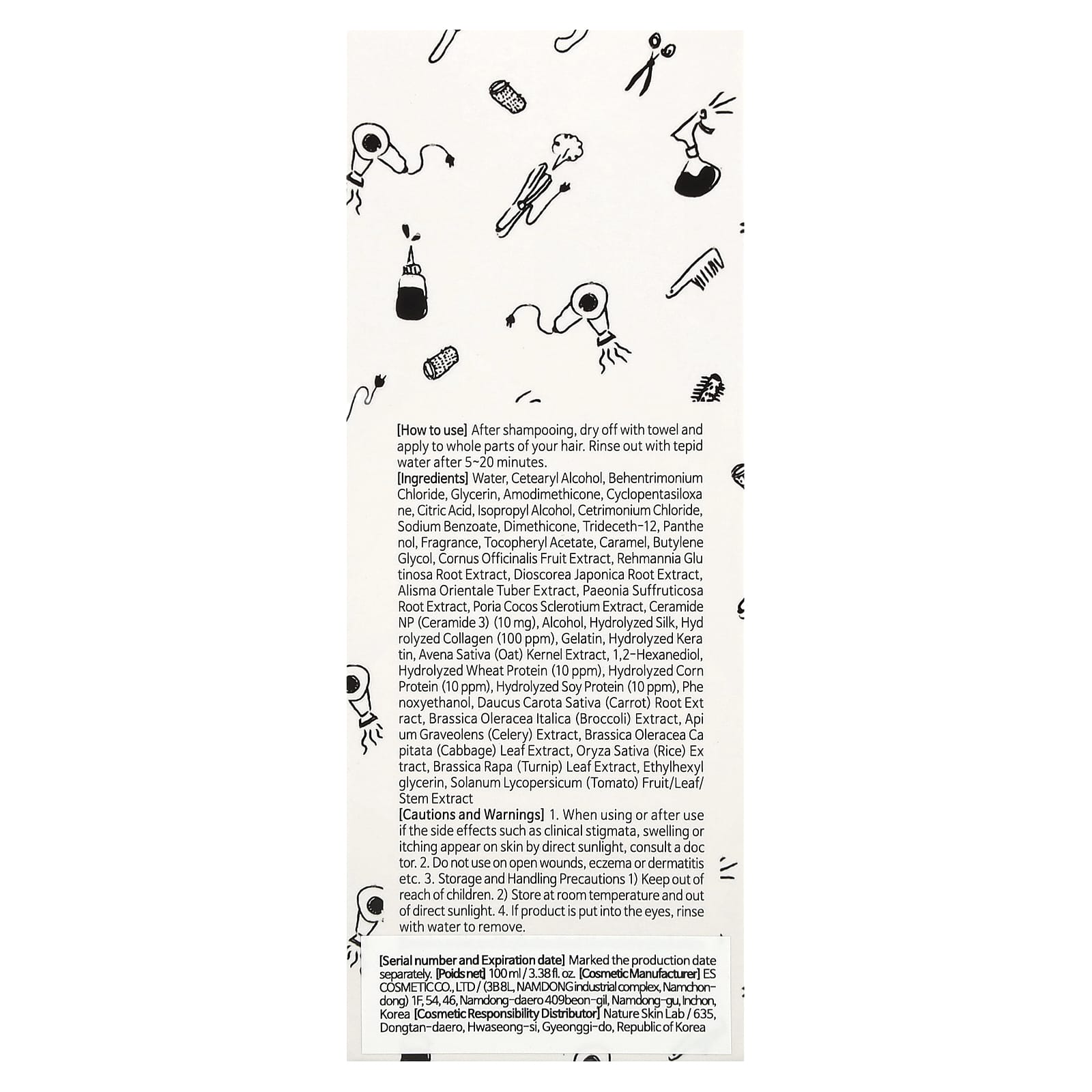 Água, álcool cetoestearílico, behentrimonium chloride, glicerina, amodimethicone, ciclopentasiloxano, ácido cítrico, álcool isopropílico, cetrimonium chloride, benzoato de sódio, dimeticona, trideceth-12, pantenol, fragrância, acetato de tocoferol, caramelo, butilenoglicol, extrato da fruta de Cornus officinalis, extrato da raiz de Rehmannia glutinosa, extrato da raiz de Discorea japonica, extrato do tubérculo de Alisma orientale, extrato de raiz de Paeonia suffruticosa, extrato de Poria cocos esclerócio, ceramida np (ceramida 3) (10 mg), álcool, seda hidrolisada, colágeno hidrolisado (100 ppm), gelatina, queratina hidrolisada, extrato de Avena sativa (aveia), 1,2-hexanediol, proteína de trigo hidrolisada (10 ppm), proteína de milho hidrolisada (10 ppm), proteína de soja hidrolisada (10 ppm), fenoxietanol, extrato da raiz de Daucus carota sativa (cenoura), extrato de Brassica oleracea italica (brócolis), extrato de Apium graveolens (aipo), extrato da folha de Brassica oleracea capitata (repolho), extrato de Oryza sativa (arroz), extrato da folha de Brassica rapa (nabo), ethylhexyl glycerin, extrato de fruta/folha/caule de Solanum lycopersicum (tomate)