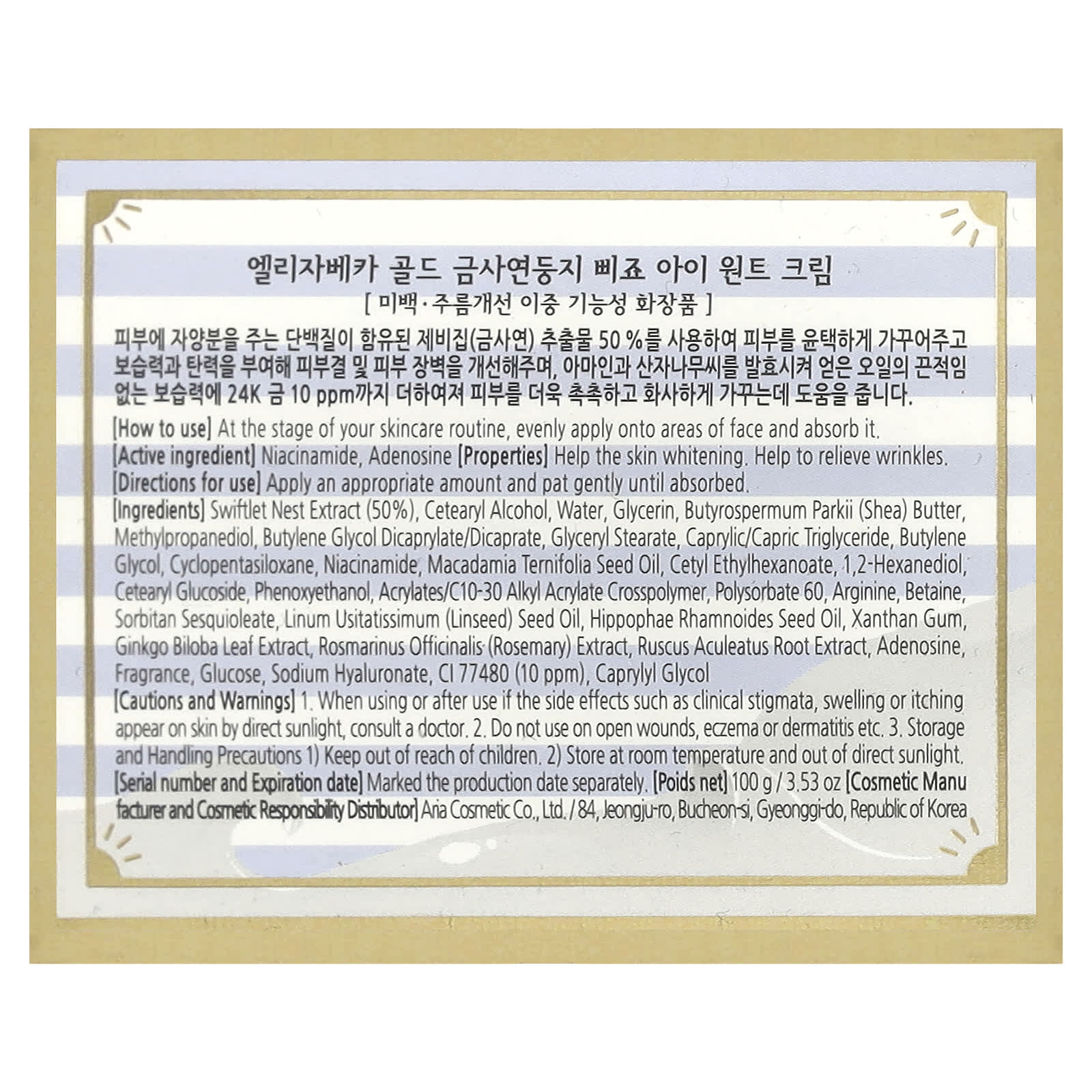 Elizavecca Gold CF-Nest-B-Jo Creme para a Área dos Olhos 100 ml (353 oz) – Elizavecca Beleza Hidratantes Faciais e Cremes Cremes para os olhos Beleza por Ingrediente Cuidado para a pele com niacinamida.
