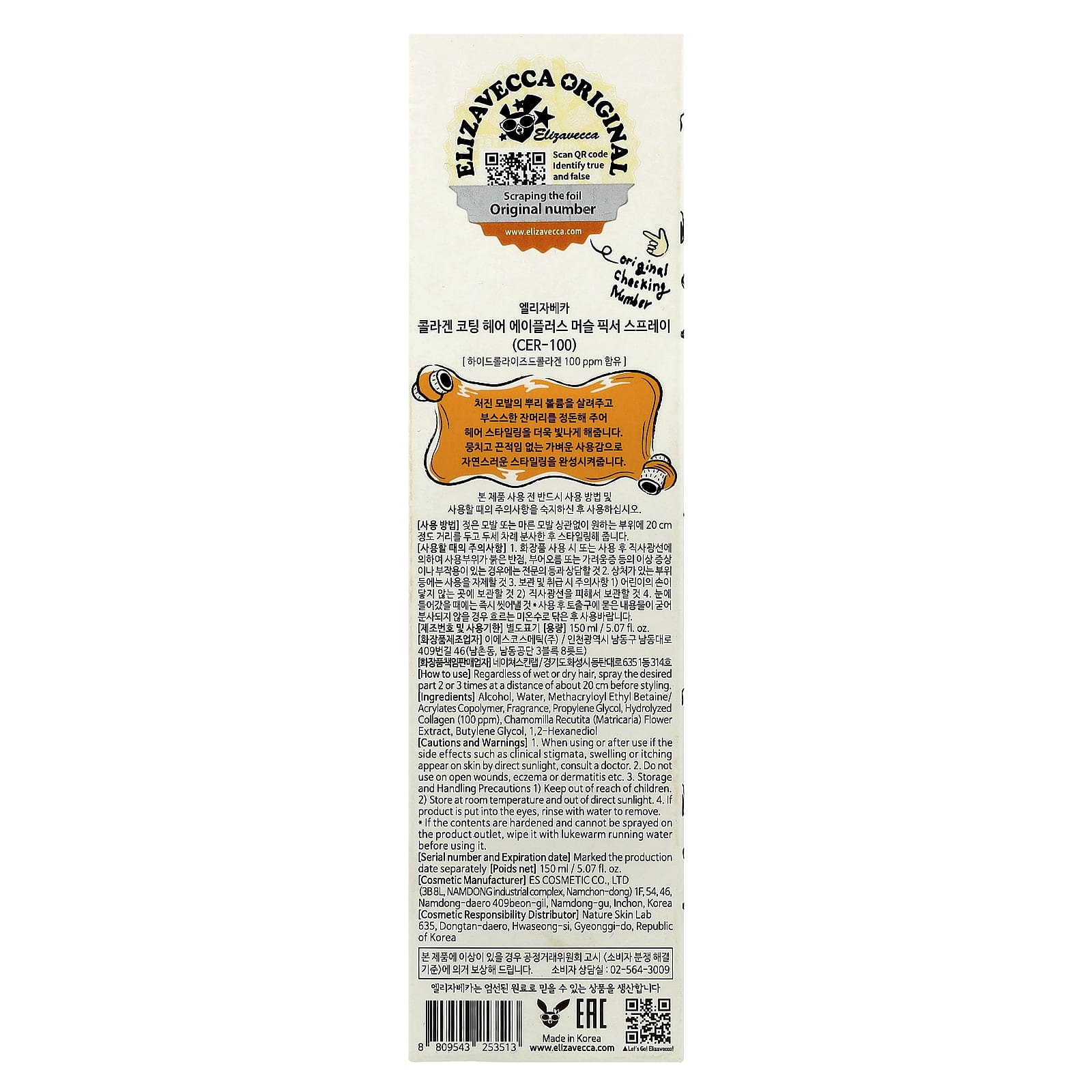 Elizavecca Spray Fixador Muscular A + Revestimento de Colágeno Cer-100 150 ml (507 fl oz) – Elizavecca Cuidados Pessoais Cabelos Modelagem dos cabelos Cuidado com os cabelos K-Beauty.