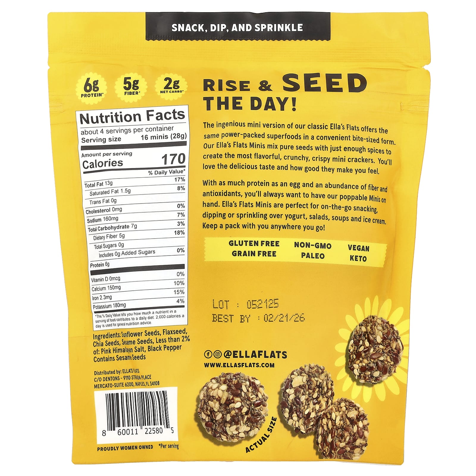 Os Minis da Ella’s Flats são perfeitos para lanchar em qualquer lugar, mergulhando ou polvilhando sobre iogurte, saladas, sopas e sorvetes. Mantenha um pacote com você em qualquer lugar que você vá!