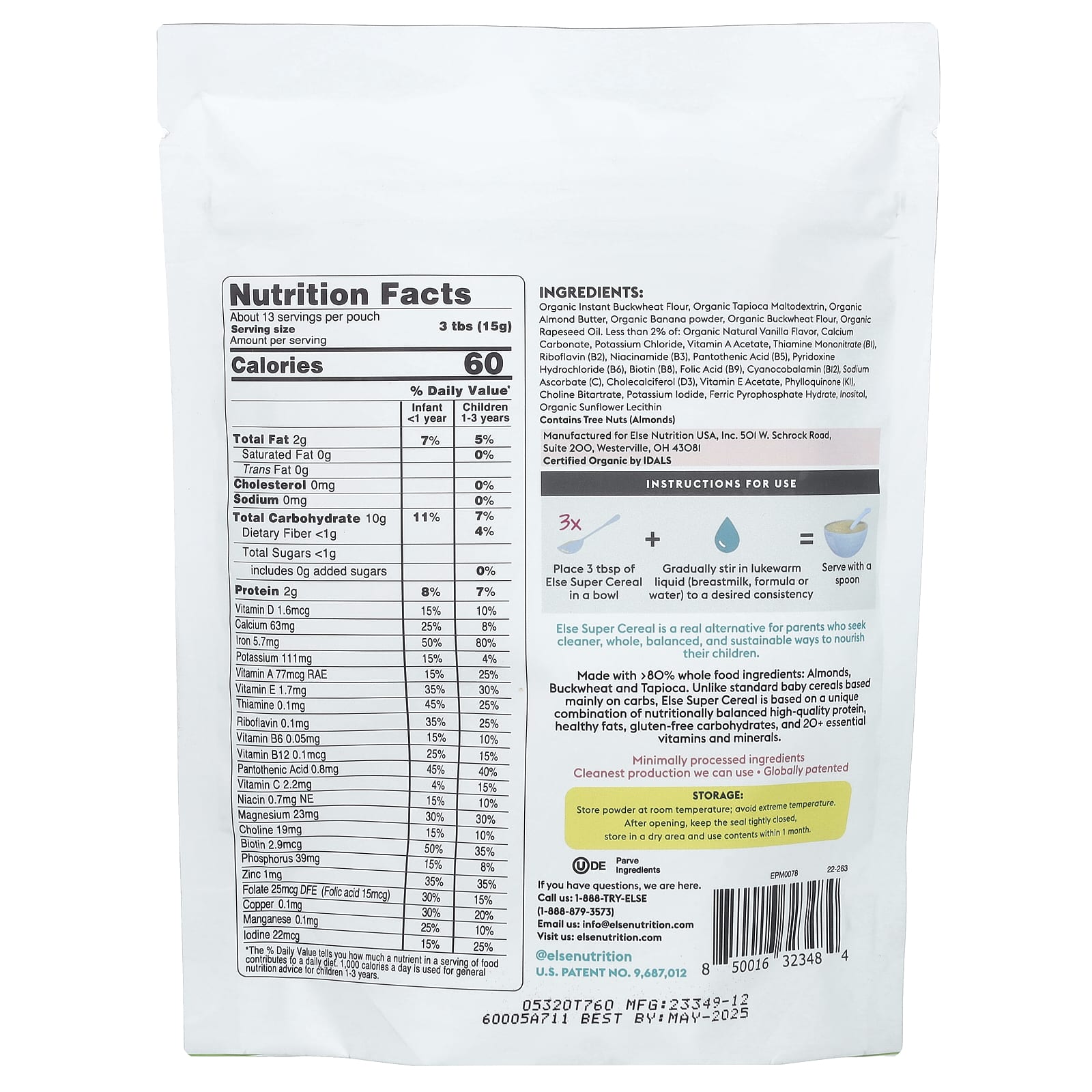 Else Bebê Supercereal de Amêndoas e Trigo Sarraceno à Base de Plantas A Partir de 6 Meses Banana 198 g (7 oz) – Else Bebês e Crianças Alimentação Cereal para bebês.