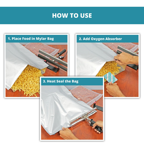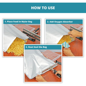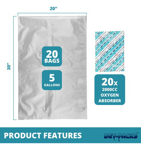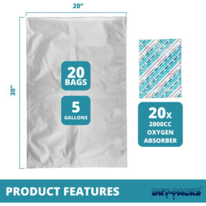 Dry-Packs 20 5 Gallon Mylar Bags with Oxygen Absorbers for Food Storage, 2000cc Oxygen Absorber, Long Term Food Storage Solution, Durable and Reliable Mylar Bags, 20×30 Silver – Heavy-Duty & Versatile Mylar Bags: Our 20×30 mylar bags for food storage are 4.3 mil thick, offering exceptional durability and puncture resistance. Ideal for long-term food storage, these mylar bags protect against light, moisture, and oxygen. – Reusable & Sealable: These 20 5-gallon mylar bags can be heat-sealed with a hot iron and resealed after opening. Each package includes oxygen absorbers (2000cc each) to maintain an airtight seal for effective food preservation. – Ideal for Long-Term Food Storage: Perfect for preserving dried and dehydrated foods like grains, coffee beans, nuts, and more. These mylar bags with oxygen absorbers ensure your food remains fresh for extended periods. – Comprehensive Protection with Oxygen Absorbers: Each bag comes with a 2000cc Oxy-Sorb oxygen absorber featuring an indicator pill to monitor oxygen levels, ensuring optimal conditions for long-term food storage. – Generous Capacity & Versatile Use: Each set includes 10 large 5-gallon mylar bags, perfect for storing grains, rice, oats, coffee beans, nuts, and more. These mylar bags for long-term food storage come with 2000cc oxygen absorbers, ensuring your food stays fresh and well-preserved.