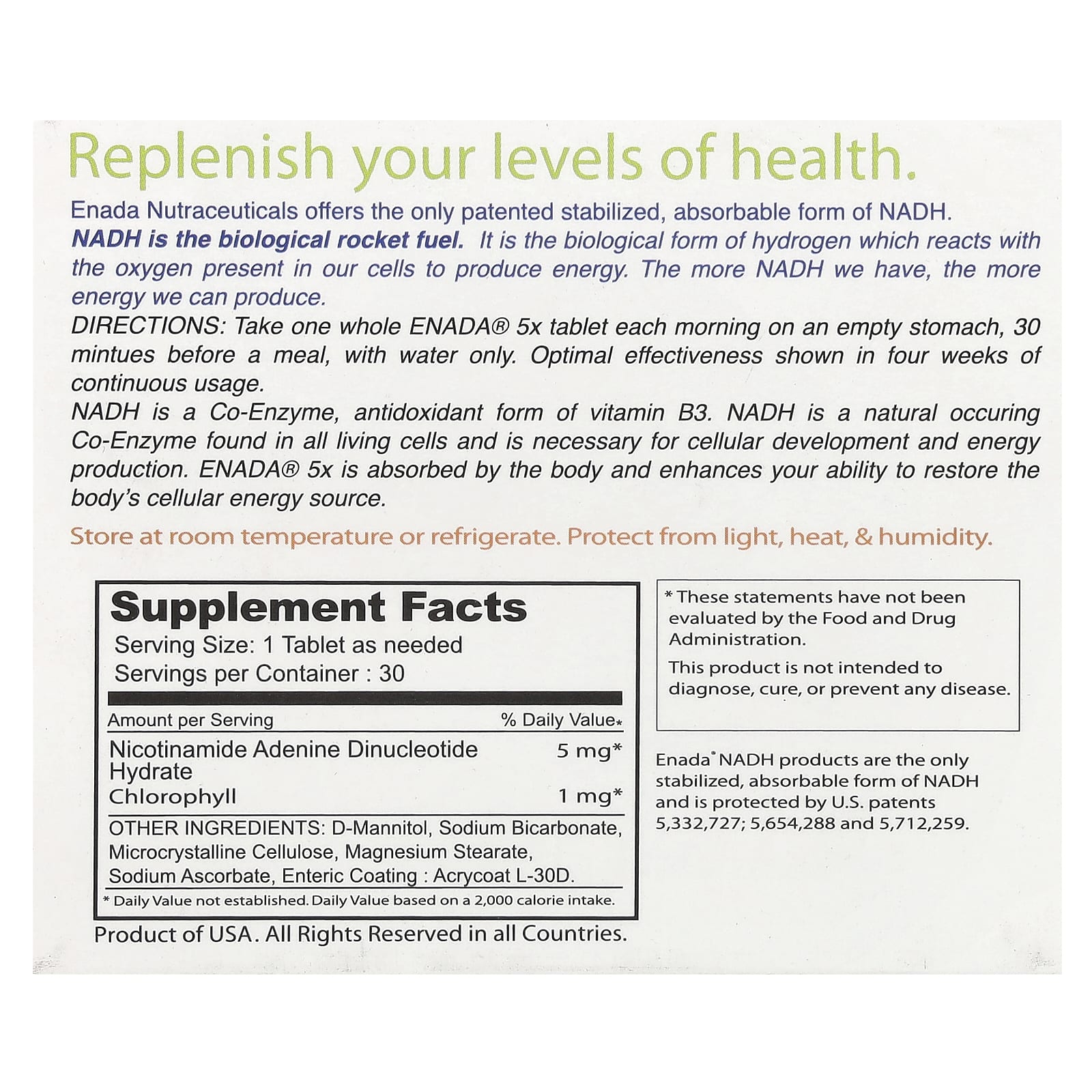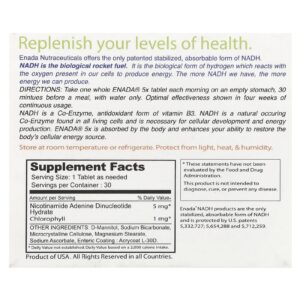 O NADH é uma forma antioxidante Coenzima da vitamina B3. O NADH é uma Coenzima de ocorrência natural encontrada em todas as células vivas e é necessária para o desenvolvimento celular e a produção de energia. ENADA® 5x é absorvido pelo corpo e aumenta sua capacidade de restaurar a fonte de energia celular do corpo.