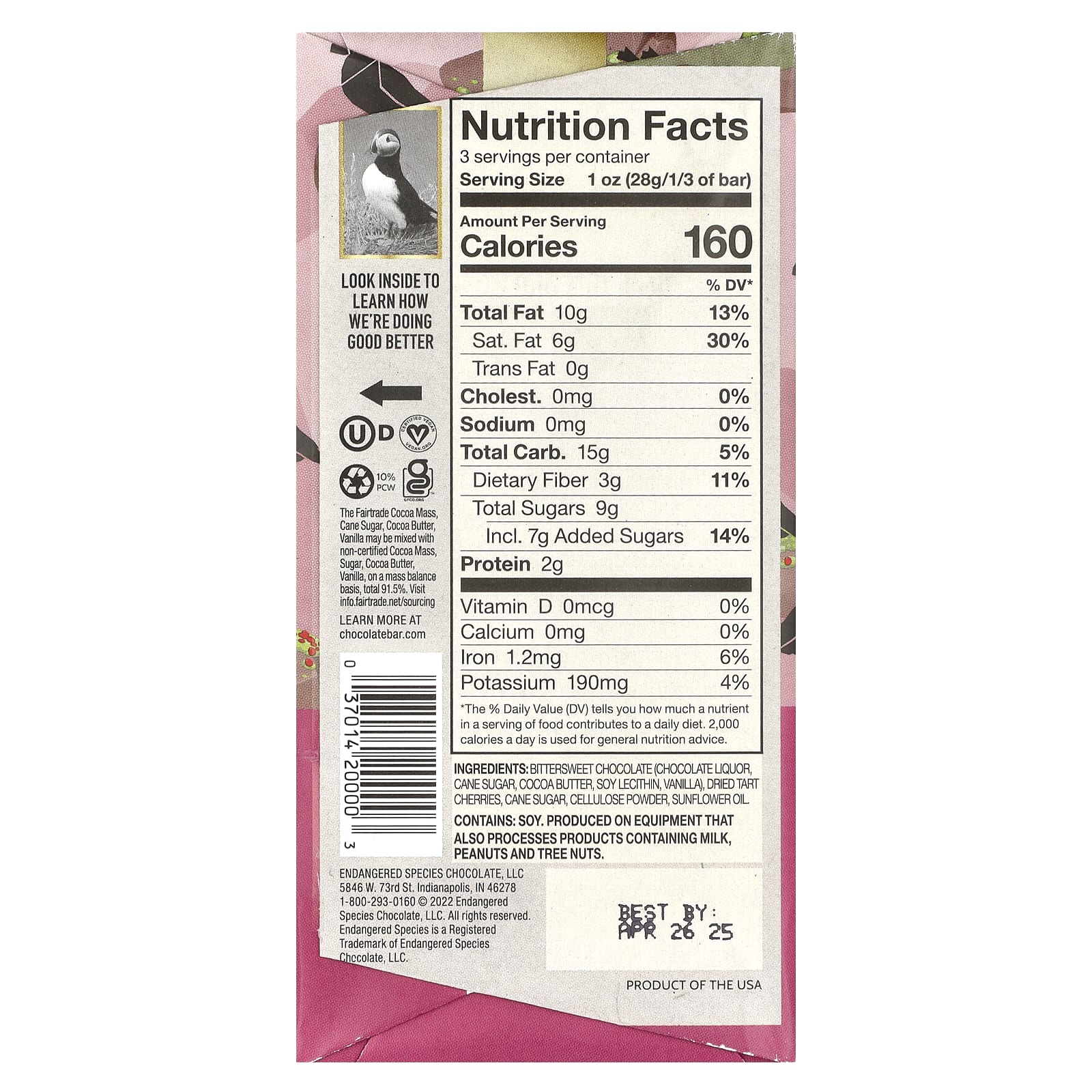 Endangered Species Chocolate Cerejas Chocolate Amargo 72% de Cacau 85 g (3 oz) – Endangered Species Chocolate Alimentos Chocolate e doces Chocolate Chocolate Amargo.