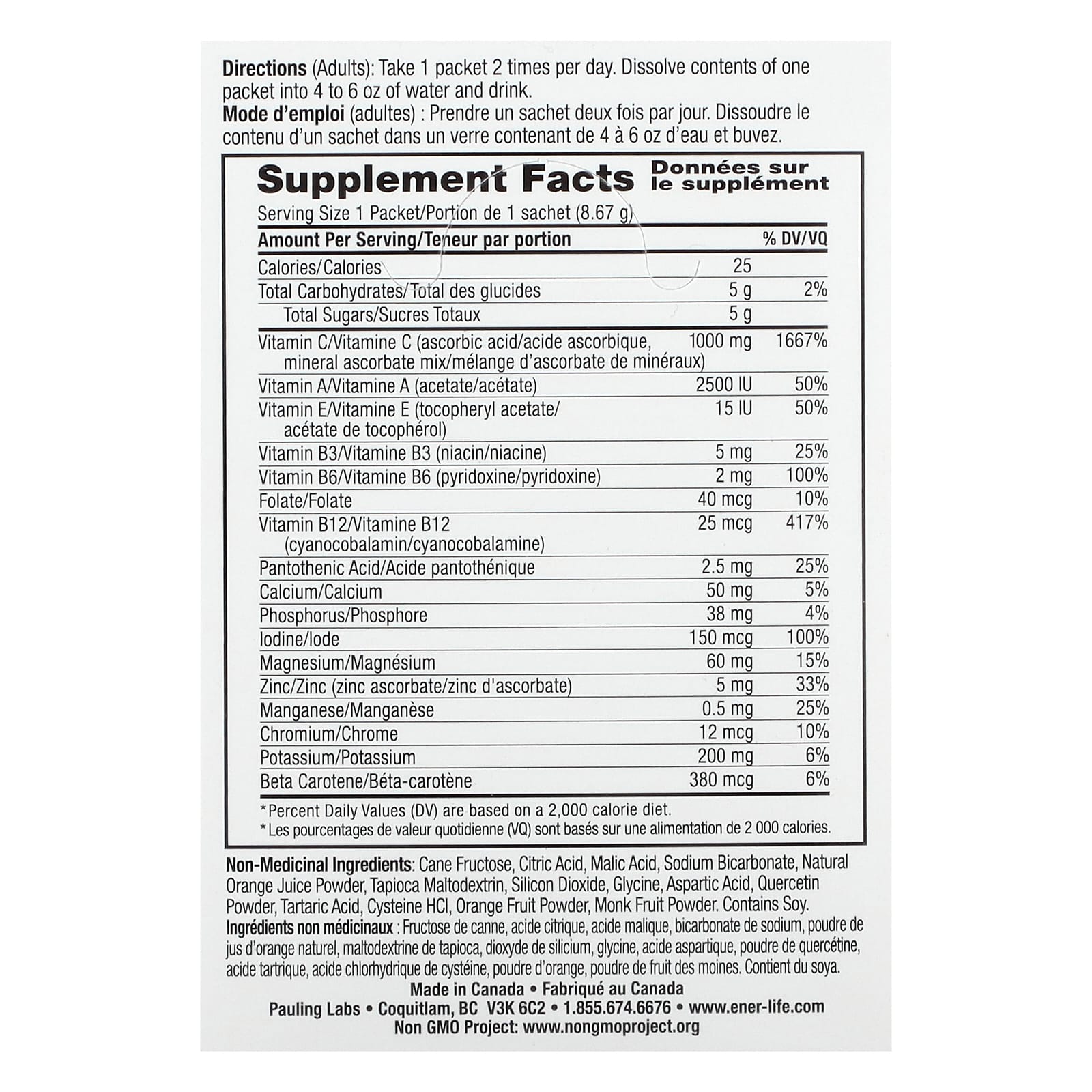 Ingredientes Não Medicinais: Frutose de cana, ácido cítrico, ácido málico, bicarbonato de sódio, suco de laranja natural em pó, maltodextrina de tapioca, dióxido de silício, glicina, ácido aspártico, pó de quercetina, ácido tartárico, cisteína HCl, laranja da fruta em pó, monges em pó.