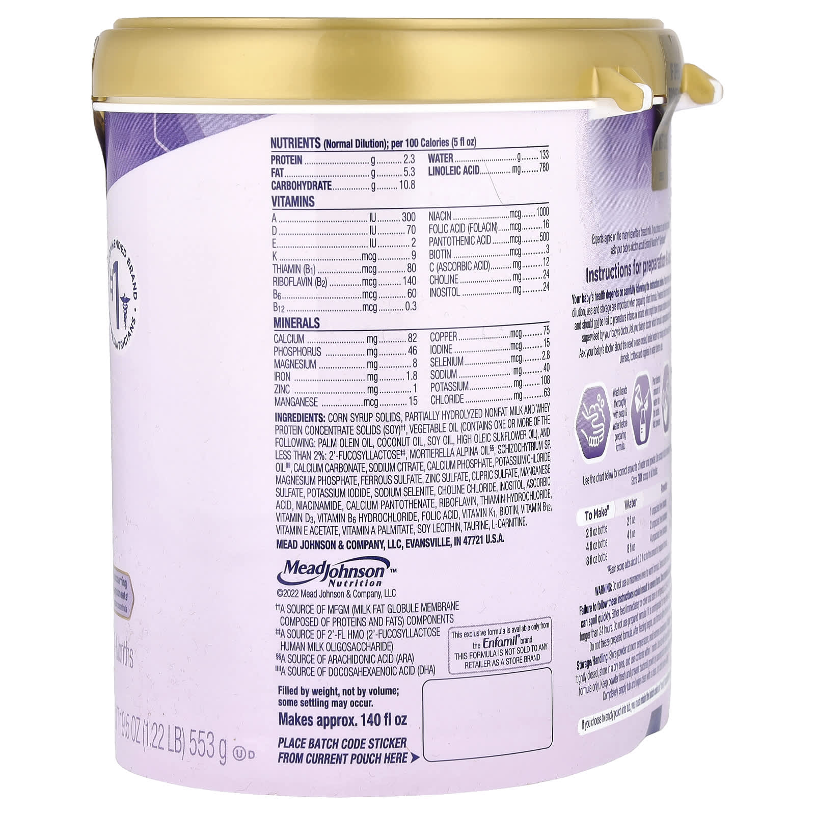 Partes sólidas de xarope de milho, leite desnatado parcialmente hidrolisado e sólidos de concentrado de proteína whey (soja)††, óleo vegetal (contém um ou mais dos seguintes ingredientes: óleo de oleína de palma, óleo de coco, óleo de soja, óleo de girassol com alto teor oleico), menos de 2%: 2′-fucosilactose#, óleo de Mortierella alpina§§, schizochytrium sp. óleo”, carbonato de cálcio, citrato de sódio, fosfato de cálcio, cloreto de potássio, fosfato de magnésio, sulfato ferroso, sulfato de zinco, sulfato cúprico, sulfato de manganês, iodeto de potássio, selenito de sódio, cloreto de colina, inositol, ácido ascórbico, nicotinamida, pantotenato de cálcio, riboflavina, cloridrato de tiamina, vitamina D3, cloridrato de vitamina B6, ácido fólico, vitamina K1, biotina, vitamina B12, acetato de vitamina E, vitamina A (palmitato), lecitina de soja, taurina, l-carnitina.