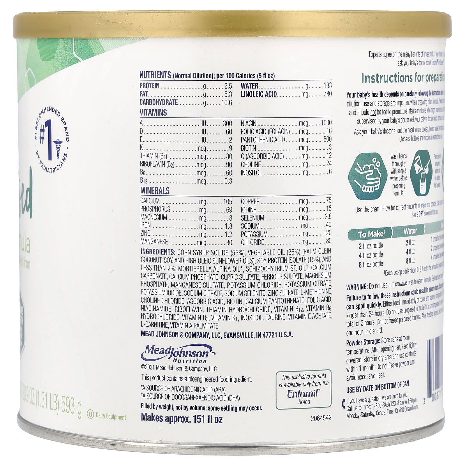 Sólidos de xarope de milho (55%), óleo vegetal (26%) (oleína de palma, coco, soja, e óleos de girassol com alto teor oleico), isolado proteico de soja (15%), menos de 2%: óleo de Mortierella alpina*, schizochytrium sp. óleo†, carbonato de cálcio, fosfato de cálcio, sulfato cúprico, sulfato ferroso, fosfato de magnésio, sulfato de manganês, cloreto de potássio, citrato de potássio, iodeto de potássio, citrato de sódio, selenito de sódio, sulfato de zinco, l-metionina, cloreto de colina, ácido ascórbico, biotina, pantotenato de cálcio, ácido fólico, nicotinamida, riboflavina, cloridrato de tiamina, vitamina B12, cloridrato de vitamina B6, vitamina D3, vitamina K1, inositol, taurina, acetato de vitamina E, l-carnitina, palmitato de vitamina A.