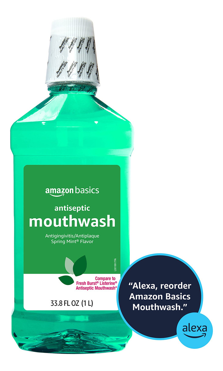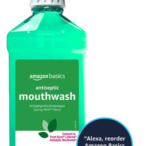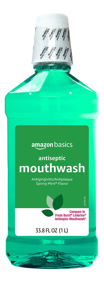 Enxaguante bucal antisséptico Amazon Basics, hortelã, 1 litro, 33,80 fl oz (pacote com 1) (anteriormente Solimo) — Um frasco de 1 litro de enxaguante bucal antisséptico de hortelã de primavera — Ajuda a controlar a placa bacteriana que causa gengivite — Mata germes que causam doenças da placa bacteriana e gengiva — Sabor refrescante de menta — Use de manhã e à noite para uma melhor higiene bucal — Se você gosta do antisséptico bucal Listerine Freshburst Enxaguante bucal, convidamos você a experimentar o enxaguante bucal antisséptico Amazon Basics – a compra por voz da Alexa está ativada: para fazer seu próximo pedido, basta dizer, Alexa, reordenar o enxaguante bucal Amazon Basics”