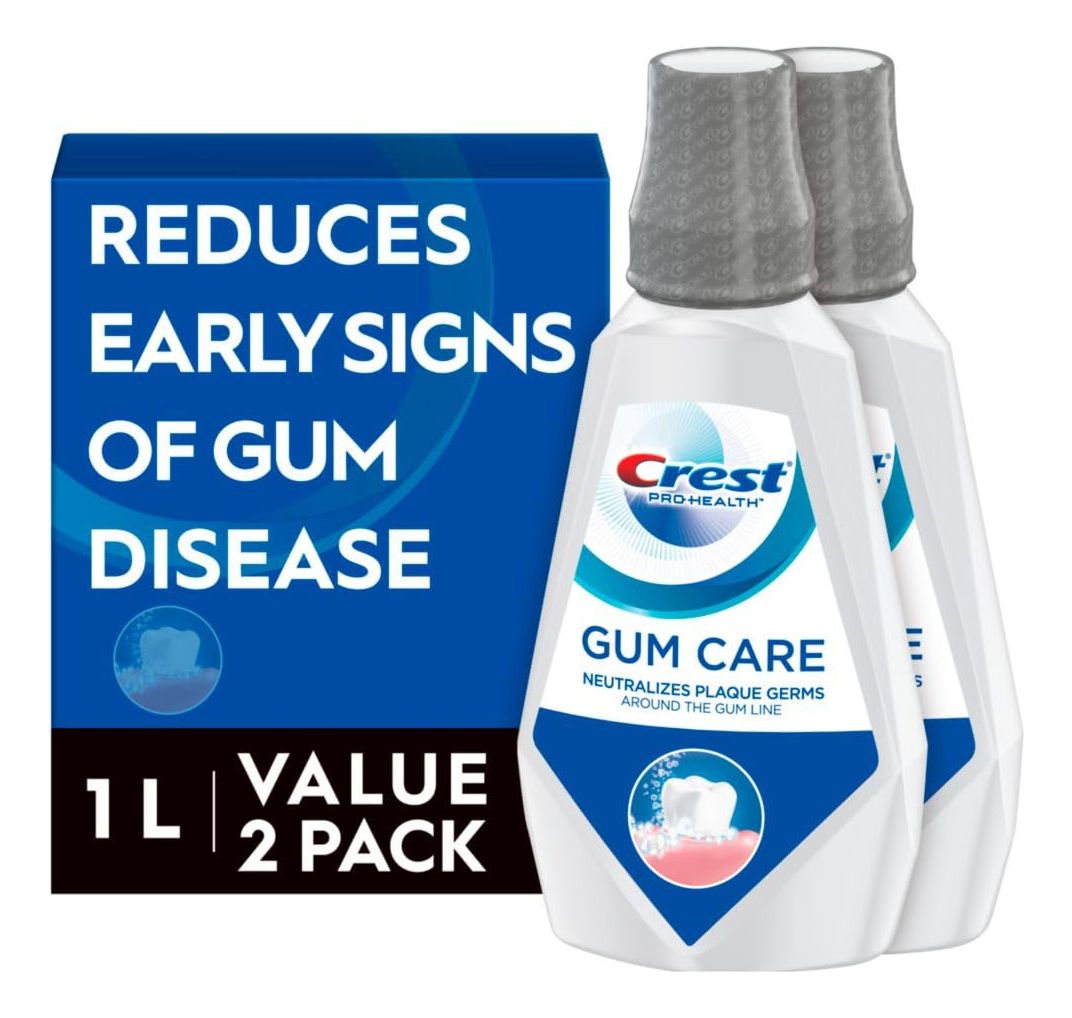 Enxaguante bucal Crest Gum Care, Cool Wintergreen, CPC (cloreto de cetilpiridínio), antigengivite/antiplaca, 1 litro (33,8 fl oz), pacote com 2 — Neutraliza os germes da placa bacteriana ao redor da linha da gengiva — Reduz os sinais precoces de doenças gengivais, incluindo sangramento gengival — Mata bactérias que causam placa bacteriana, gengivite e mau hálito — Sem álcool Lavagem – O sabor fresco de gaultéria deixa o hálito revigorado