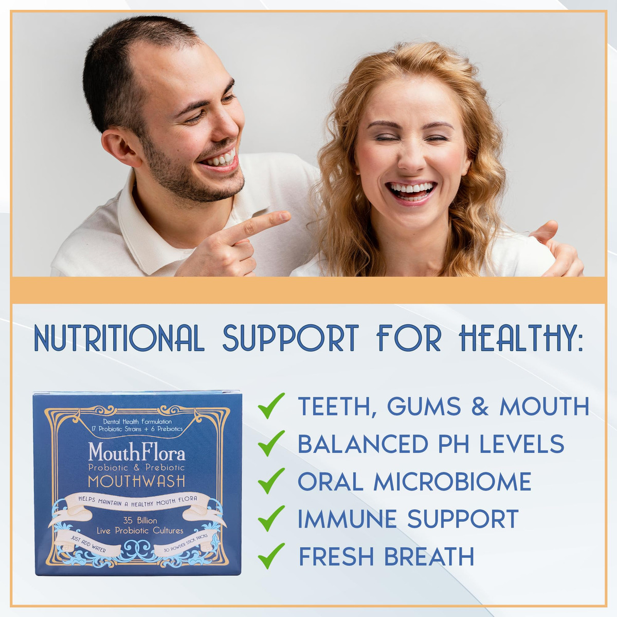 MouthFlora – Enxaguante bucal probiótico e prebiótico – TUDO O QUE ELES DIZEM SOBRE O ENXAGUANTE BUCAL ESTÁ ERRADO: Seja à base de álcool, sem álcool ou mesmo aqueles rotulados como “naturais” com óleos essenciais, a maioria dos enxaguatórios bucais é projetada para matar bactérias. Mas aqui está o problema que eles não estão discernindo. Eles eliminam as bactérias nocivas e as bactérias benéficas de que sua boca precisa para florescer. – INTERRUPÇÃO DO BIOMA ORAL: Sua boca abriga uma comunidade diversificada de microrganismos, que desempenham um papel fundamental não apenas na saúde bucal, mas também na saúde sistêmica. Ao matar bactérias indiscriminadamente, os enxaguatórios bucais tradicionais podem perturbar esse equilíbrio delicado, potencialmente causando uma série de problemas. – POR QUE UM BIOMA ORAL EQUILIBRADO É VITAL: As bactérias benéficas na boca ajudam a decompor os alimentos, sintetizam vitaminas essenciais e protegem contra bactérias nocivas. Um microbioma oral interrompido pode levar ao crescimento excessivo de bactérias nocivas, resultando potencialmente em mau hálito, problemas gengivais e outros problemas de saúde bucal. – APOIANDO O ECOSSISTEMA DA SUA BOCA: Entre no “MouthFlora”, um produto revolucionário projetado não apenas para limpar, mas para nutrir e equilibrar o bioma bucal da boca. Em vez de travar uma guerra contra todas as bactérias, o “MouthFlora” foi projetado para nutrir as boas e, ao mesmo tempo, manter as nocivas sob controle. Ao fazer isso, garante um ambiente oral harmonioso e equilibrado. – APROVEITANDO O PODER DOS PROBIÓTICOS E PREBIÓTICOS: Com 17 cepas probióticas e 6 prebióticos, o “MouthFlora” oferece uma abordagem cientificamente comprovada para apoiar um microbioma oral equilibrado. A alta concentração de culturas probióticas vivas (35 bilhões por porção) garante uma comunidade próspera de bactérias benéficas.