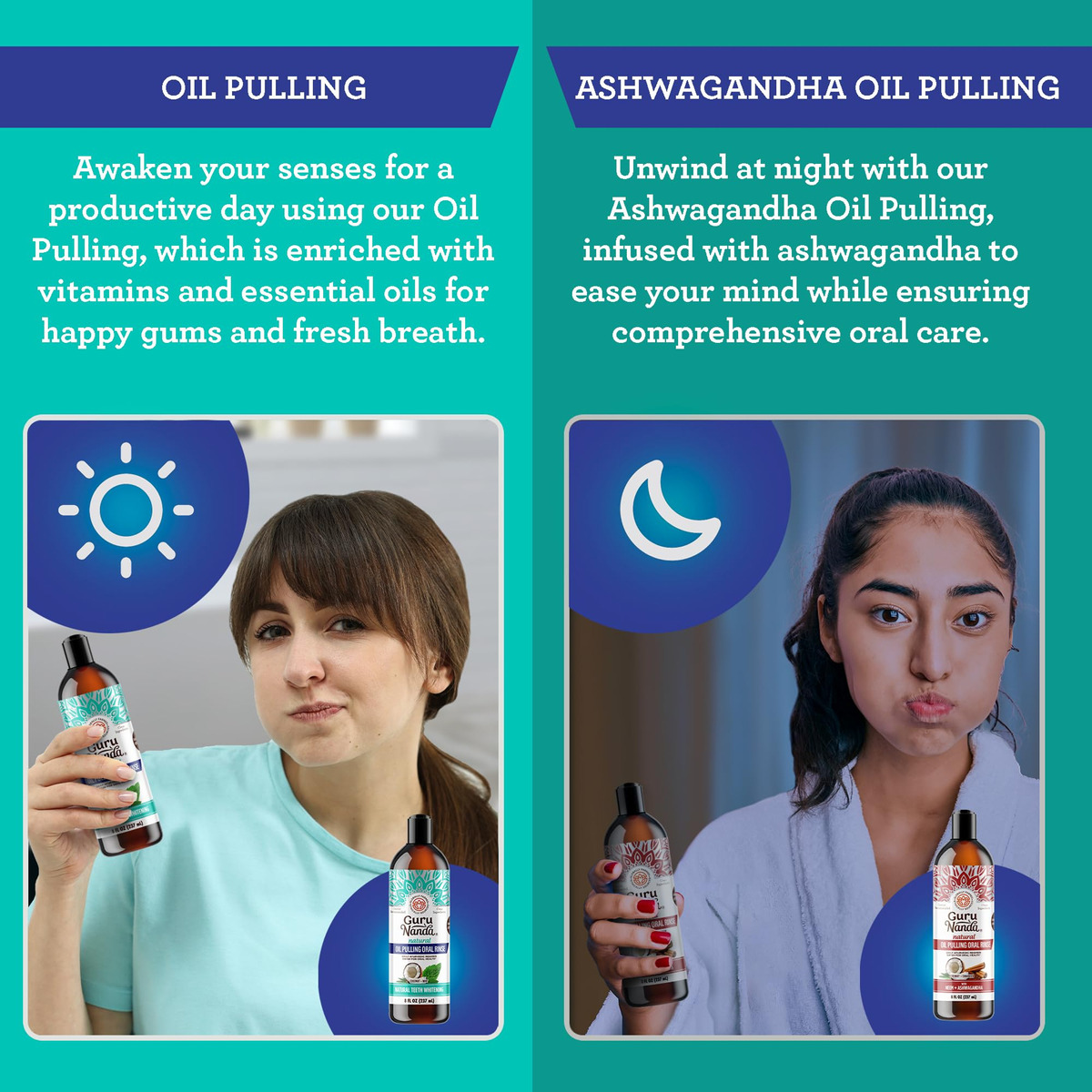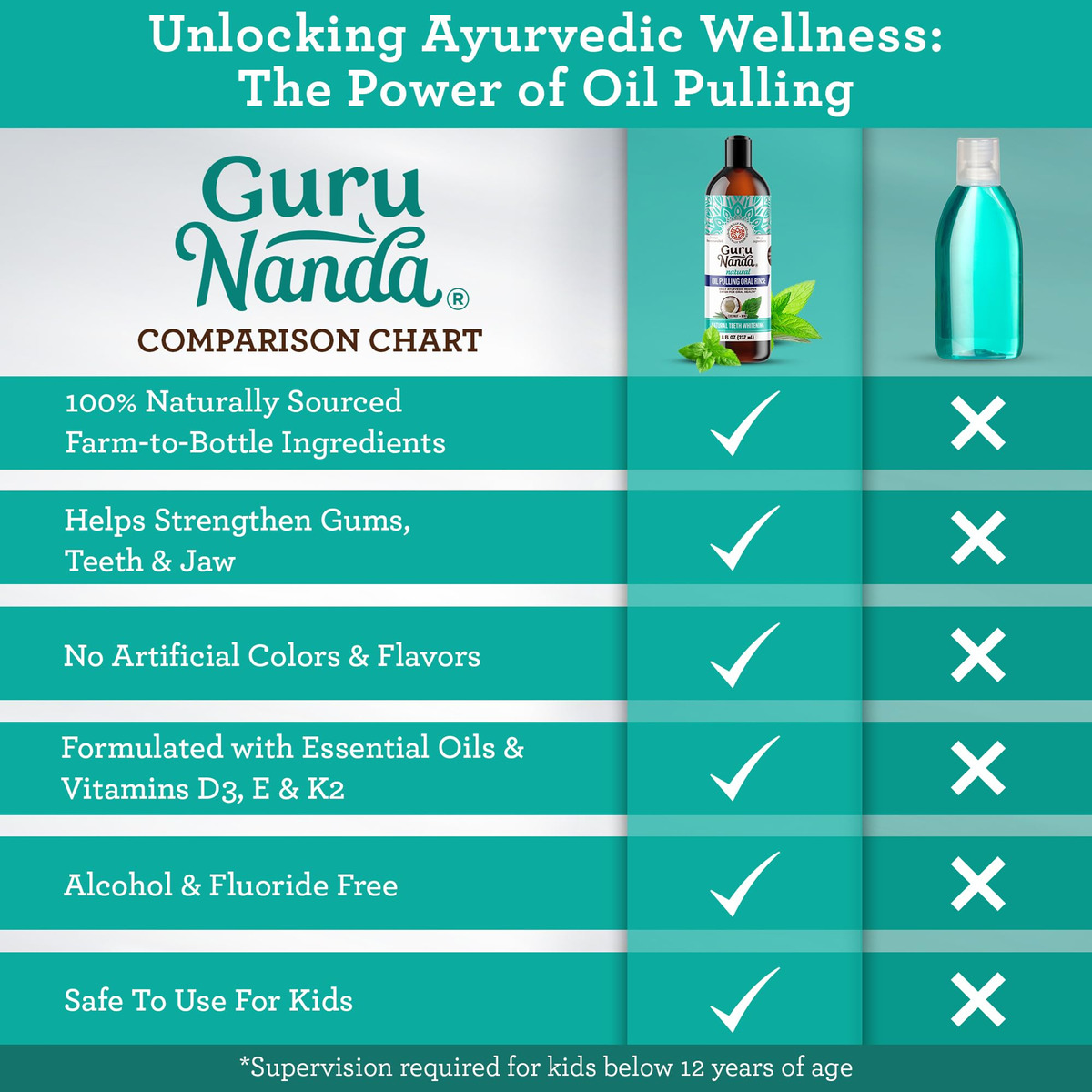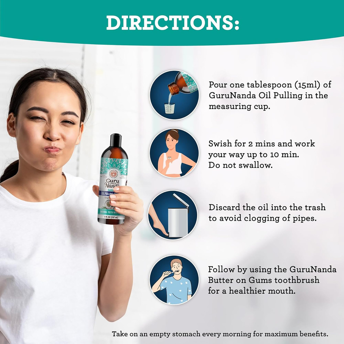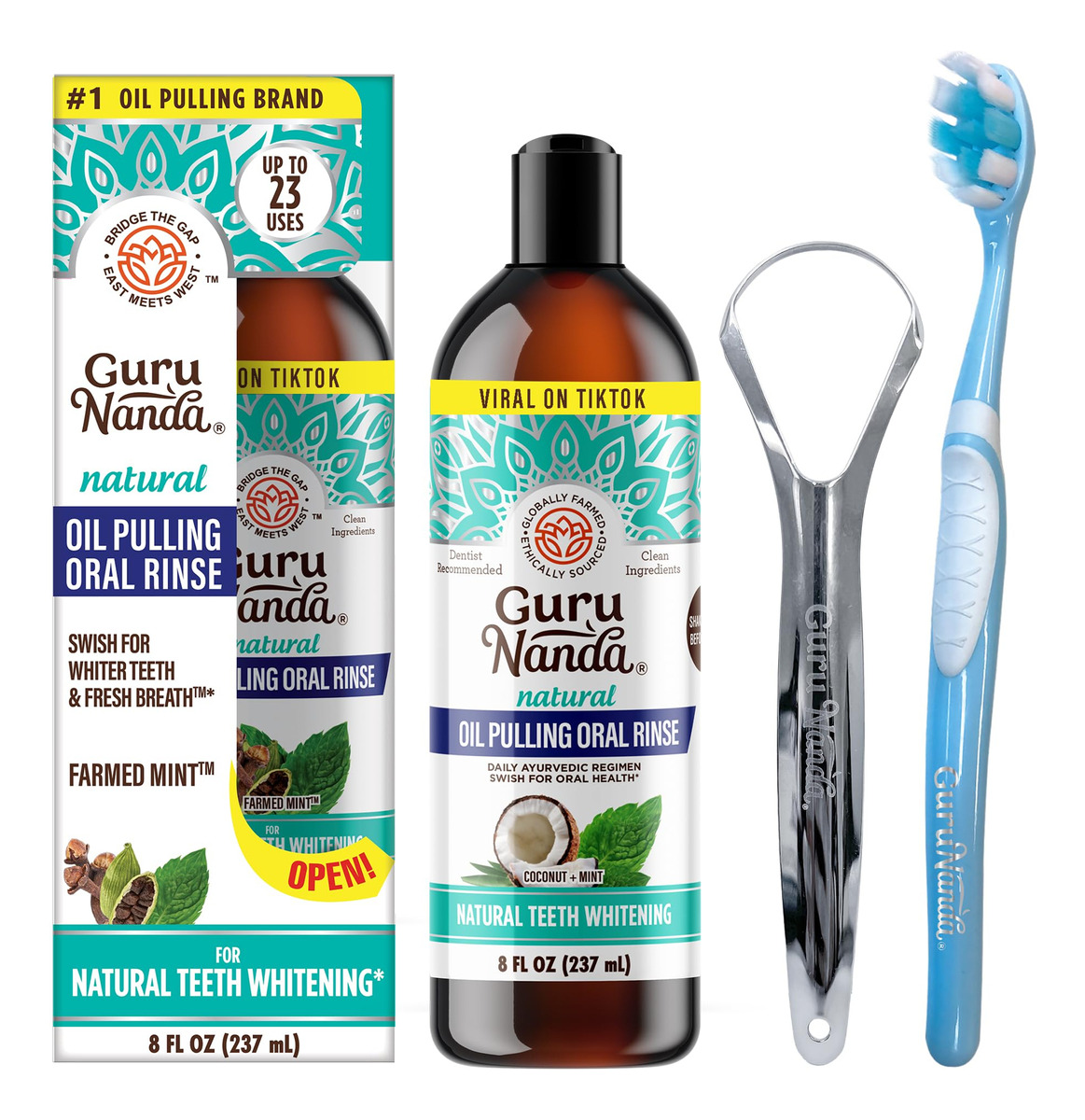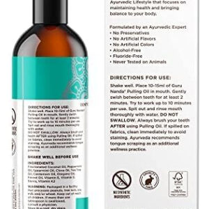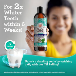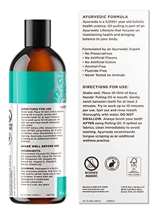 Óleo clareador de coco GuruNanda com vitaminas e óleos essenciais para a melhor experiência de extração de óleo. Tem uma mistura ayurvédica de óleo de coco, vitaminas e óleo essencial puro de hortelã. Enxágue oral clareador natural dos dentes, ajuda no mau hálito, gengivas saudáveis 236,5 ml. O óleo de extração GuruNanda Coconut Mint Formula é feito apenas com óleo de coco MCT, vitaminas D, E, K2 e óleos essenciais puros para um toque bucal naturalmente refrescante. Ele não contém OGM, álcool, flúor ou conservantes e é livre de cores e sabores artificiais. Nossa mistura única de ingredientes e óleos essenciais é fiel à receita original do Ayurveda. O óleo de coco e o óleo essencial de hortelã deixam um sabor limpo e fresco e duradouro na boca. Esta fórmula específica é uma forma holística de cuidar da higiene bucal. – O GuruNanda Pulling Oil é um enxágue natural, pré-escovado, inspirado na sabedoria ayurvédica, com menor densidade do que o óleo de coco ou gergelim. Ele vem em um frasco de 8 fl oz com um raspador de língua dentro. – Ele contém óleo de coco 100% puro, óleos essenciais (melaleuca, hortelã, cravo, orégano, erva-doce, hortelã e cardamomo) e vitaminas D3, E e K2. Hidrofóbico e inspirado em lipídios, ele melhora sua higiene bucal. – O óleo de extração ajuda na produção de saliva e na remoção de placa bacteriana e auxilia na saúde de dentes e gengivas e no hálito fresco. Não substitui o atendimento odontológico profissional, mas sim uma medida preventiva. – Despeje 10-15 ml de óleo, mexa por 2 minutos com o copo medidor fornecido e aumente gradualmente para 10 minutos. Jogue o óleo no lixo para evitar entupir os canos. Mantenha o estômago vazio todas as manhãs para obter os melhores resultados. – É orgulhosamente feito nos EUA com ingredientes nacionais e internacionais. Livre de flúor ou adição de conservantes, é seguro para uso por crianças de 12 anos ou mais (com supervisão) e adultos.