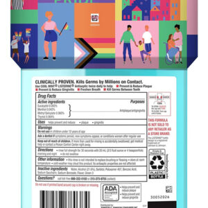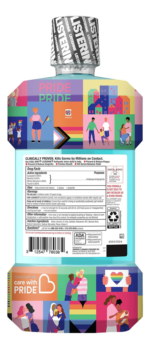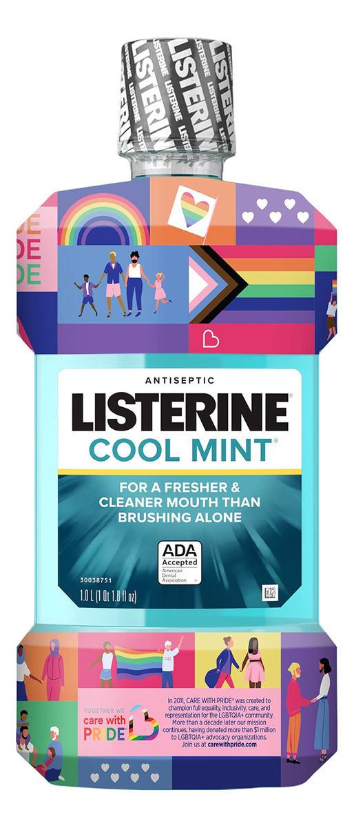 Enxaguante bucal antisséptico Listerine Cool Mint para matar 99% dos germes que causam mau hálito, placa bacteriana e gengivite, sabor fresco de menta, cuidado especial com embalagem Pride, frasco de 1 litro a 1 litro de enxaguante bucal antisséptico Listerine Cool Mint na edição especial. A embalagem Care with Pride mata 99,9% dos germes que causam mau hálito, placa bacteriana e gengivite para uma boca mais fresca e limpa do que escovar sozinho – Um enxaguante bucal que mata germes para o mau hálito e a placa bacteriana, o Listerine é 5 vezes mais eficaz do que o uso do fio dental na redução da placa*, ao mesmo tempo em que oferece hálito fresco e proteção contra germes – Um O enxaguante bucal antisséptico aceito pela ADA, o enxaguante bucal antisséptico Listerine Cool Mint é 99% derivado natural** e oferece proteção contra germes contra mau hálito, placa bacteriana e gengivite quando usado duas vezes ao dia. Obtenha o máximo de resultados e obtenha todos os benefícios de matar germes desse enxaguante bucal fresco enxaguando por 30 segundos duas vezes ao dia, de manhã e à noite, e experimente uma sensação refrescante e limpa – Desde 2011, cuide com A Pride defendeu a igualdade total, inclusão, cuidado e representação para a comunidade LGBTQIA+ e doou mais de 1,5 milhão de dólares para organizações de advocacia