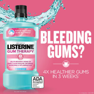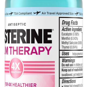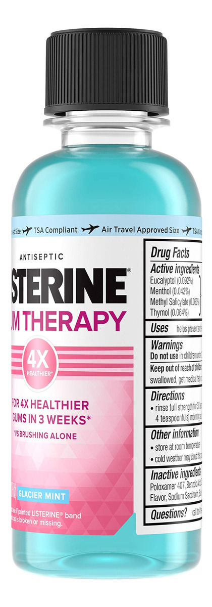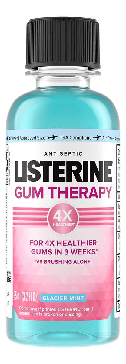 Enxaguante bucal antiplaca e antigengivite Listerine Gum Therapy, enxágue oral antisséptico ajuda a reverter os sinais de gengivite precoce, aceito pela ADA, tamanho de viagem compatível com a TSA, Glacier Mint, 95 ml (pacote com 6) – frasco de viagem de 95 mililitros compatível com a TSA de enxaguante bucal Listerine Gum Therapy antiplaca e antigengivite para ajudar a limpar a boca e refrescar a boca suaviza o hálito com um sabor refrescante de menta glaciar — Este enxaguante bucal aceito pela ADA foi especialmente desenvolvido para promover a saúde gengival, ajudando a reverter os sinais de doenças gengivais precoces, como sangramento, vermelhidão e inflamação, por 4 vezes gengivas mais saudáveis em 3 semanas versus escovar sozinho quando usado duas vezes ao dia – Da marca #1 de enxaguantes bucais vendidos sem receita médica, esse enxágue oral também ajuda a remover a placa bacteriana, uma das principais causas de doenças gengivais. O enxaguante bucal para cuidados com as gengivas limpa abaixo da linha da gengiva, onde a escovação não chega, e é feito com os óleos essenciais antiplaca bacteriana e anti-gengivite eucaliptol, mentol, salicilato de metila e timol como ingredientes ativos – Para proteger suas gengivas dos germes causadores de gengivite e promover uma limpeza total da boca, enxágue com força total com 20 mL do anti- enxaguatório bucal para gengivite de manhã e à noite. Não engula
