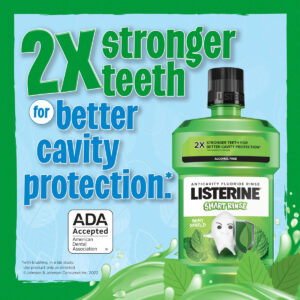 Enxaguante bucal infantil Listerine Smart Rinse, aceito pela ADA, enxaguante bucal anticavitário sem álcool, enxágue oral para proteção da cavidade dentária, sabor Mint Shield para higiene bucal infantil, 500 ml a 500 mililitros de enxaguante bucal Listerine Smart Rinse sem álcool para crianças com sabor de menta para fortalecer e proteger os dentes contra cáries quando usado como parte de uma rotina regular de higiene bucal – Formulado com fluoreto de sódio e fosfato acidulado, este enxágue oral infantil sem álcool limpa a boca além da escovação e ajuda a prevenir cáries dentárias difíceis de alcance lugares onde a escovação possa faltar – O enxaguante bucal Anticavity limpa removendo e tingindo partículas e detritos de alimentos para que seu filho possa ver facilmente as evidências na pia de uma boca mais limpa. O enxágue bucal infantil também refresca o hálito matando 99% dos germes do mau hálito – Em um estudo de laboratório, o enxaguante bucal infantil Smart Rinse ofereceu duas vezes mais fortes para melhor proteção da cavidade dentária com escovação em vez de escovar sozinho quando usado duas vezes ao dia – Este enxaguante bucal é aceito pela Associação Dentária Americana (ADA) para ajudar a prevenir cáries e vem em um divertido sabor Mint Shield para crianças. Para usar, enxágue vigorosamente com 10 mL (2 colheres de chá) colheres) do enxaguatório bucal com flúor por 1 minuto, 2x por dia